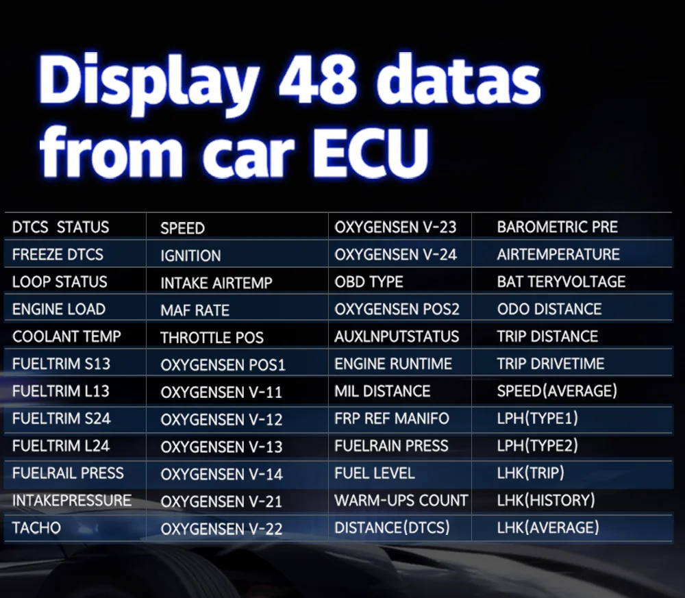 Основная функция:OBD + GPS 2 в 1 двойная рабочая система,Которые могут работать на всех транспортных средствах.1. Отображение информации о режиме OBD: Скорость транспортного средства, температура воды, напряжение, расход топлива, об/мин, один пробег, общий совокупный пробег, время в пути, системное время, давление впуска, температура масла, соотношение воздуха и топлива, давление Турбины, давление впуска, испытание на ускорение, испытание тормозов, считывание потока данных.Будильник:Сверхскоростная сигнализация, скоростная сигнализация, высокая температура воды, Сигнализация низкого напряжения, сигнализация неисправности двигателя, четкий код неисправности, свободное переключение между километром и милями,Км/ч и MPH переключение свободно,°C & ℉Свободно переключается.2. Отображение информации о режиме GPS: Скорость, время в пути, Спутниковое время, высота, количество сателлитов, направление движения, один пробег, напряжение, испытание на ускорение, испытание тормозов.Сигнализация: Сигнализация превышения скорости, Сигнализация низкого напряжения, свободное переключение между километром и милями.