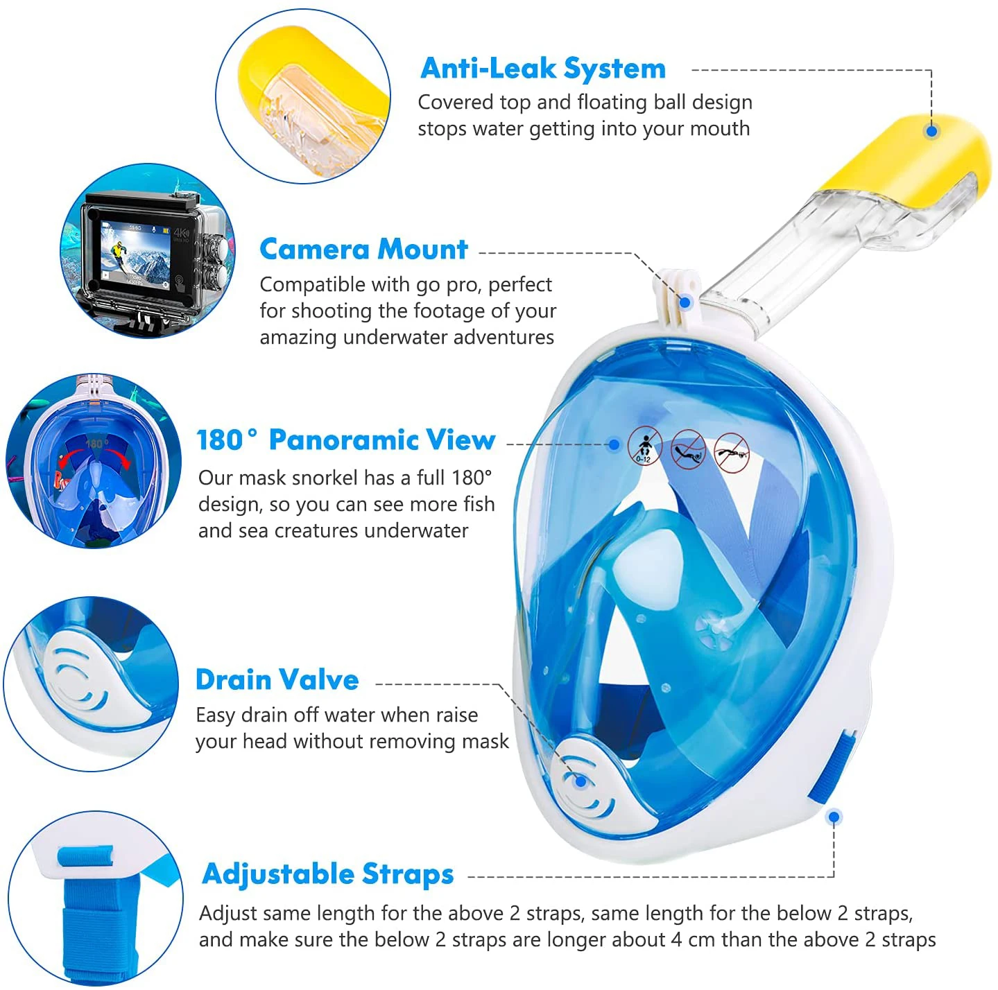 Подводное плавание с панорамным видом на 180 градусов и маска для дайвинга-оснащен двойным воздушным каналом, чтобы предотвратить запотевание и сохранить дальность обзора чистой. Наслаждайтесь нетронутым океаном и подводными приключениями без помех.