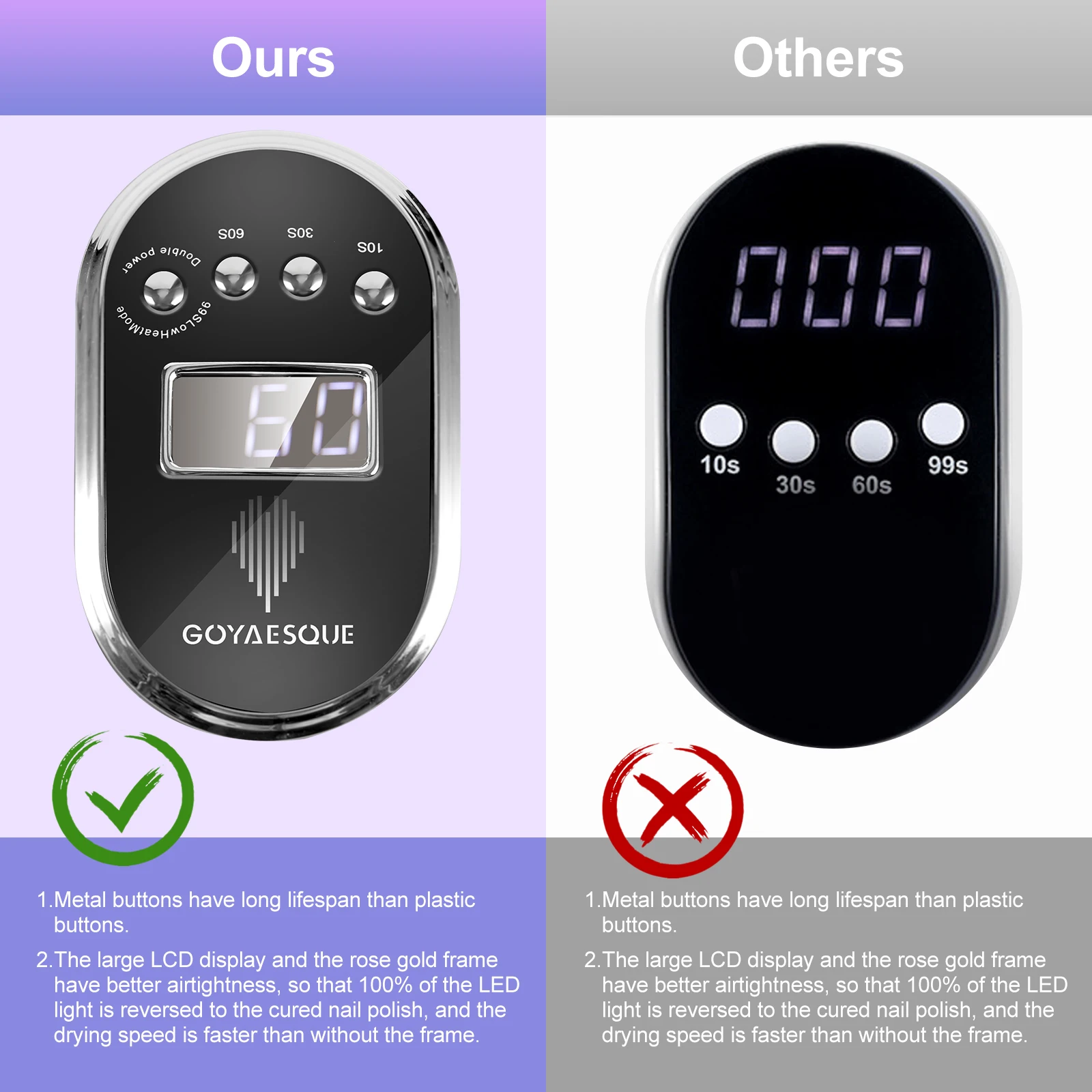 Слева сзади. Как использовать GOYAESQUE? 1. Подключите вилку. 2. Когда время подсчитывается, нажмите кнопку еще раз, чтобы перейти в режим ожидания для отдыха. 3. Как только лампа для ногтей загорится, пользователи могут выбрать раз на 30s/60s/99s двойной мощности. 4. Если пользователи не используют кнопки настройки времени, инфракрасный датчик начинает работать, когда кладет руки на машину.
