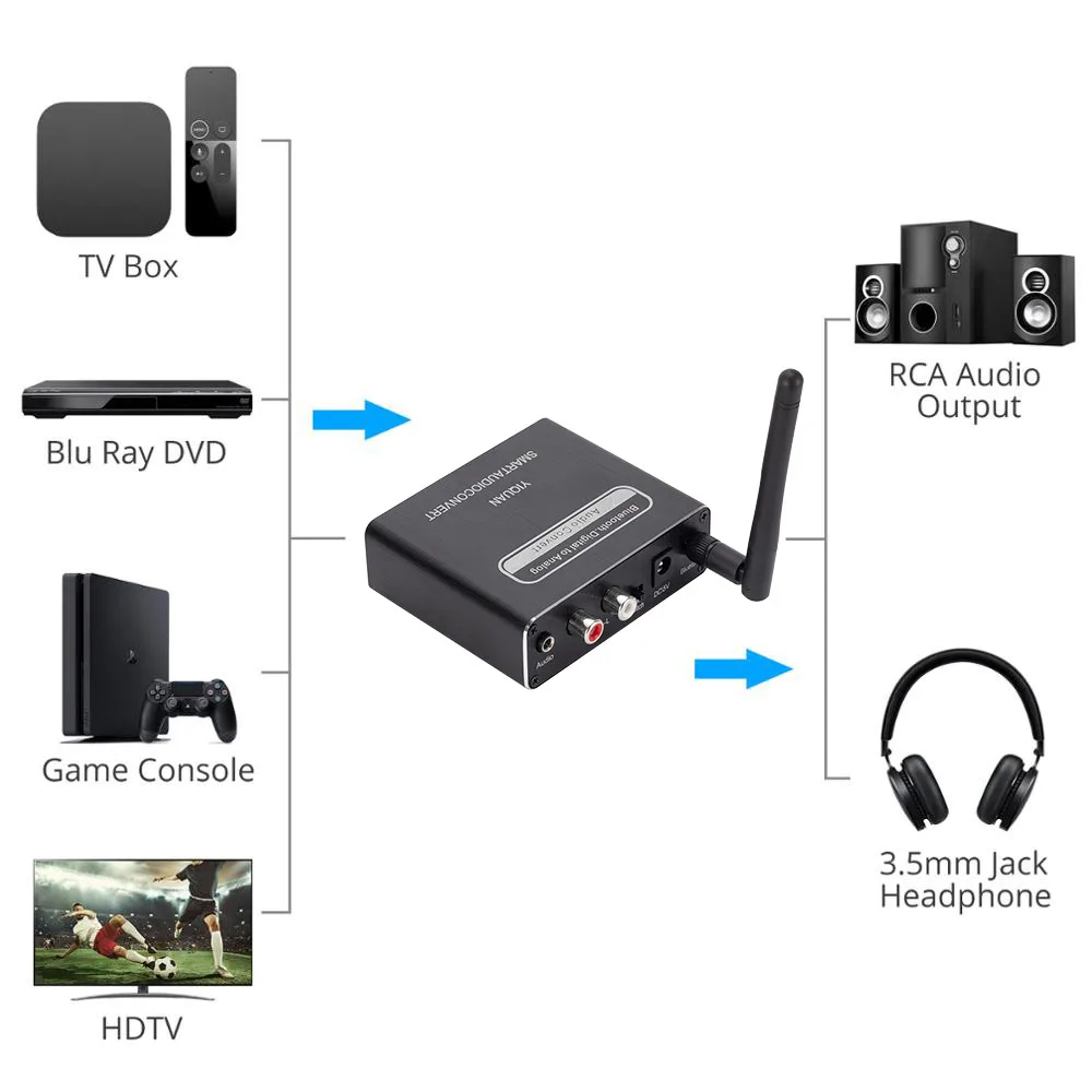 Этот продукт может преобразовывать цифровой аудиосигнал оптоволоконной, коаксиальной и совместимой с Bluetooth передачи в стереоаналоговый аудиосигнал, подключенный к усилителю. Помогите пользователям решить проблему подключения аналоговых усилителей к различным аудиоинтерфейсам. Этот продукт отлично подходит для домашних кинотеатров, учебных заведений, учебных заведений, конференц-залов, магазинов бытовой техники и других мест.
