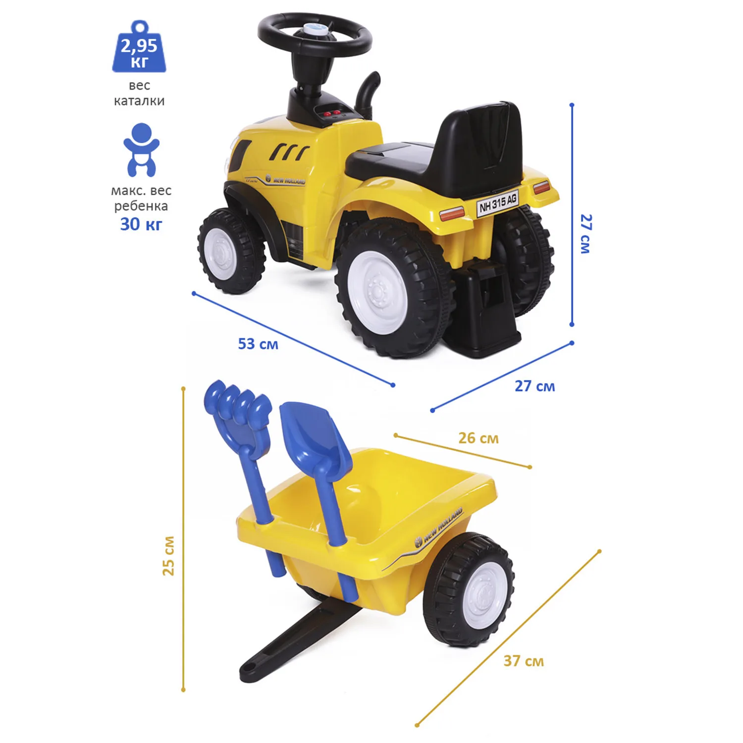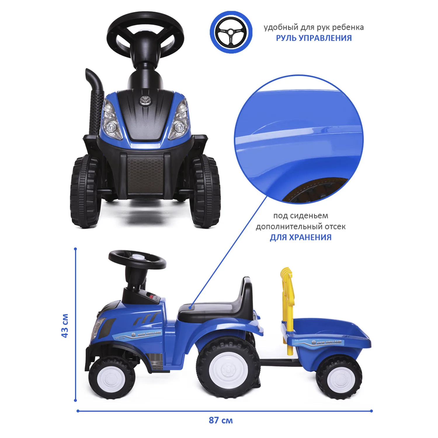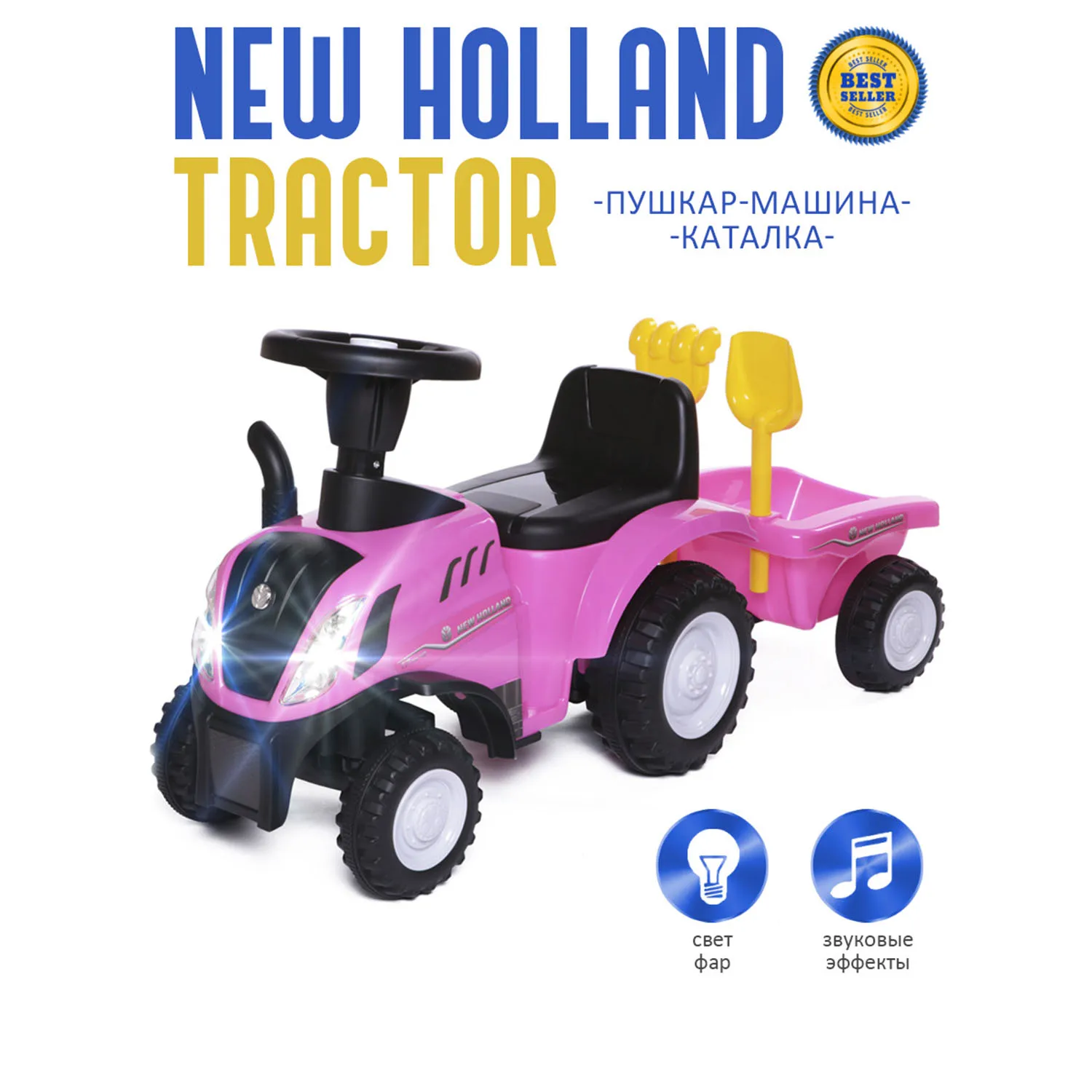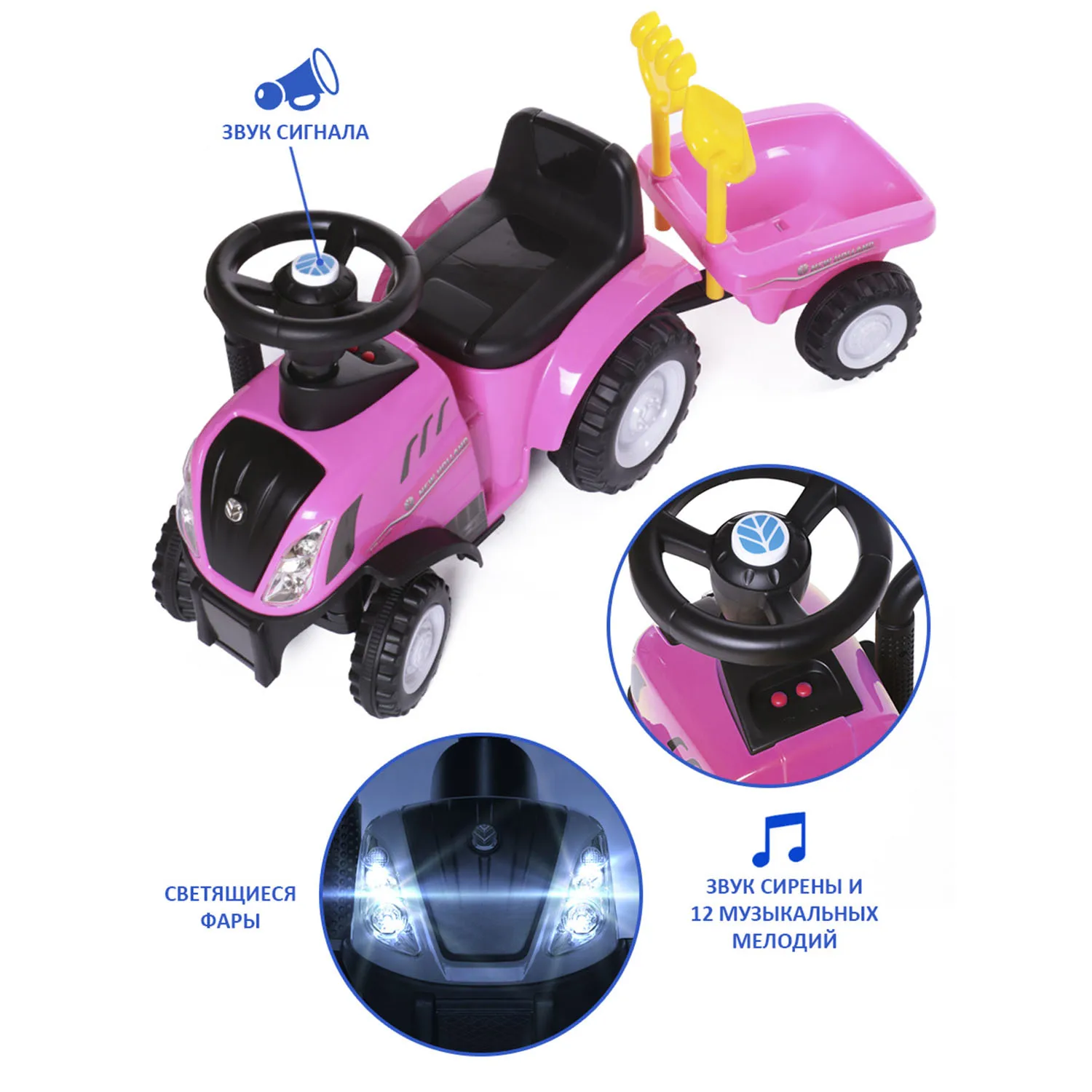 New Holland Tractor – это не просто каталка, а целый передвижной игровой центр от бренда Babycare: трактор, прицеп и аксессуары (грабли и лопатка).