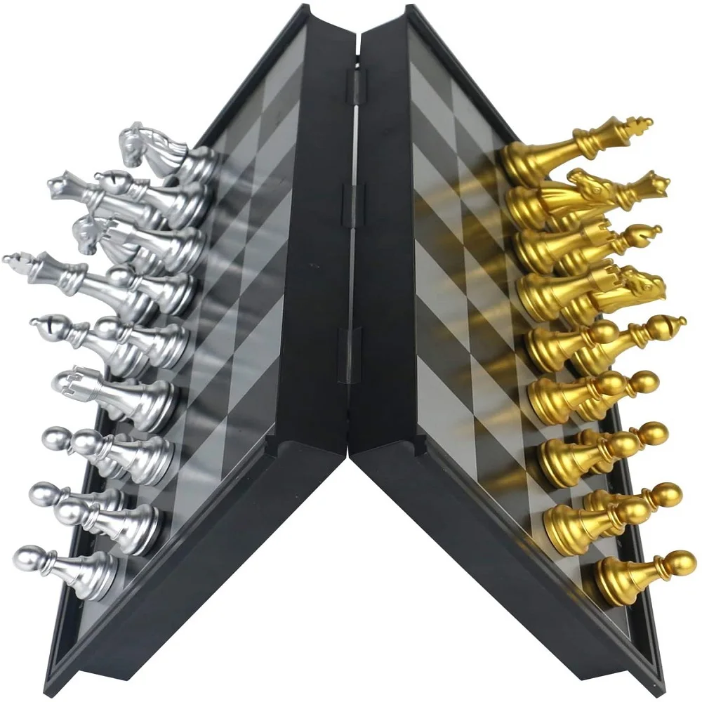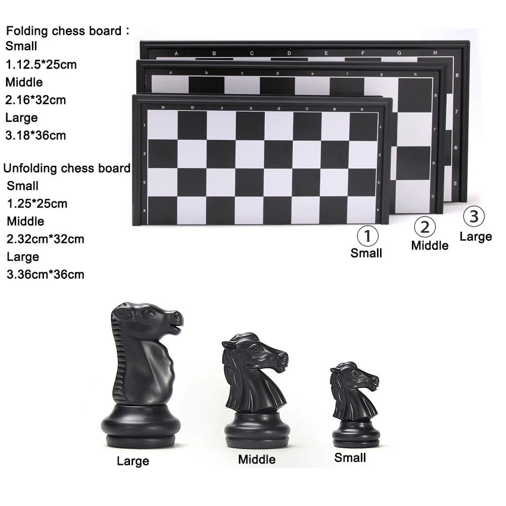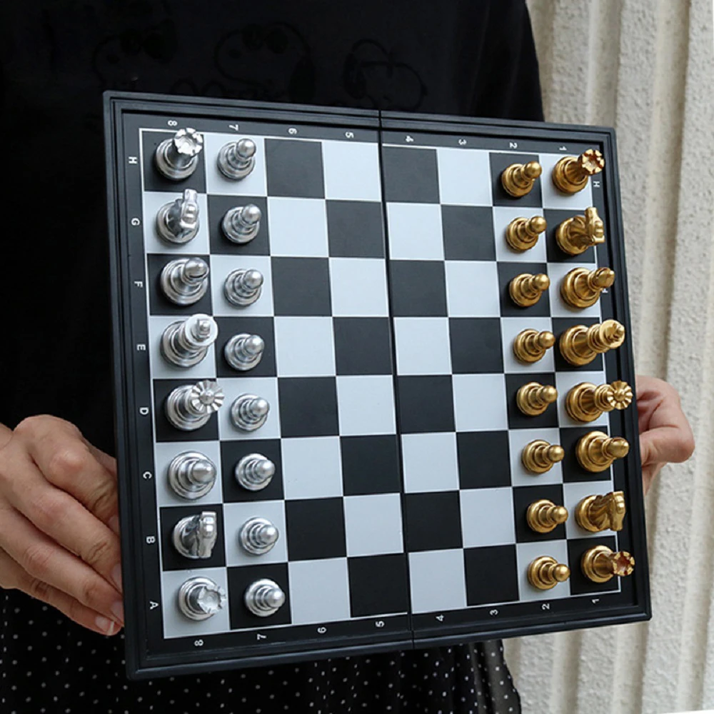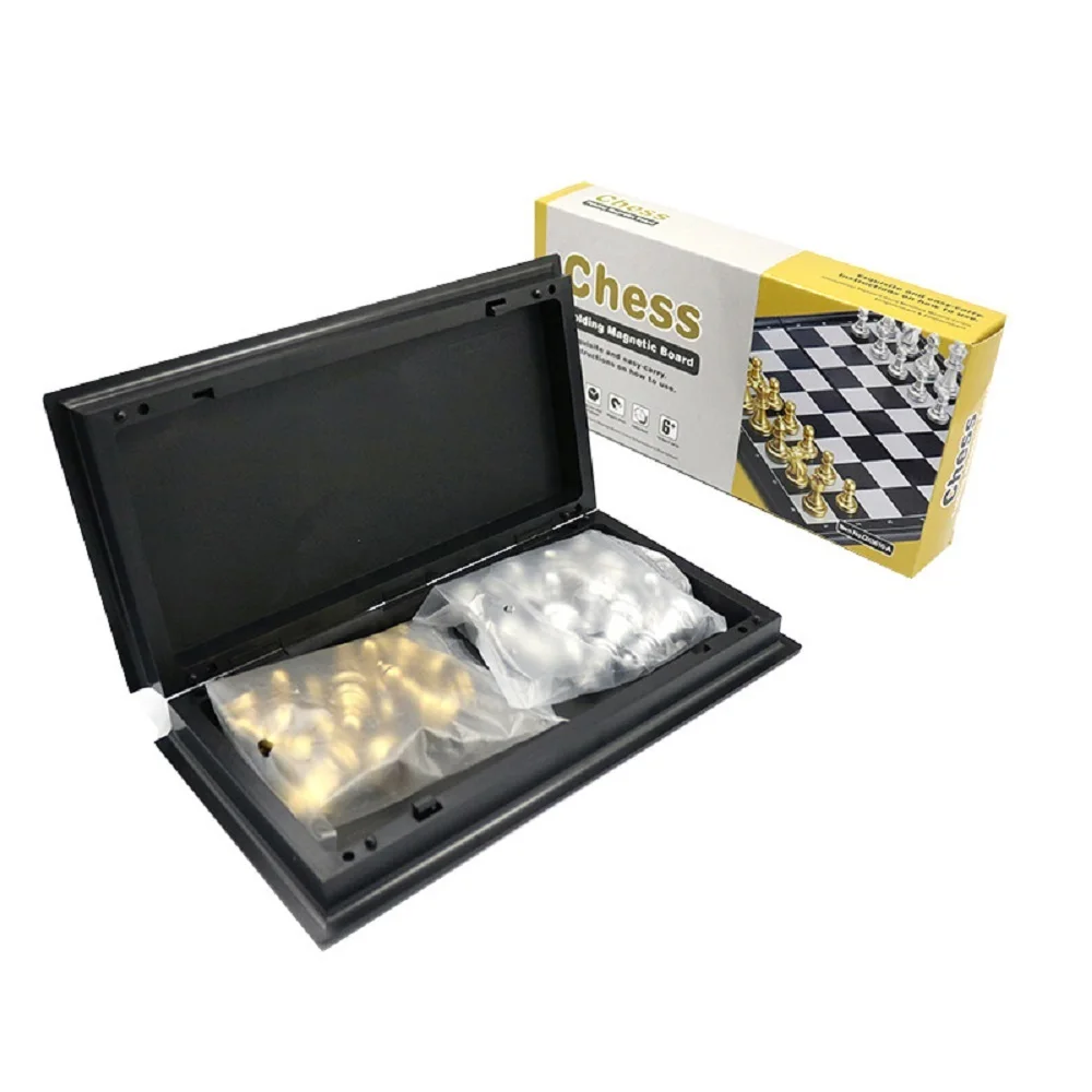 Набор для шахмат для детей и взрослых включает в себя: складную магнитную шахматную доску, базовую инструкцию по эксплуатации и шахматные фигуры в двух цветах (магнитная шахматная доска для сохранения шахматных фигур на месте).