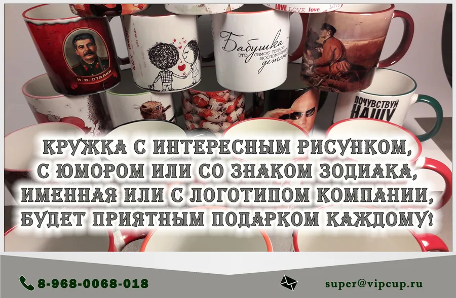 В данном бизнесе как компания с 2004 года. В нашем интернет-магазине Vipcup несколько сотен наименований кружек, так же представлены на маркетплейсах и в соцсетях: в ОК и ВК, в Instagram. Видеообзоры кружек смотрите на нашем канале
