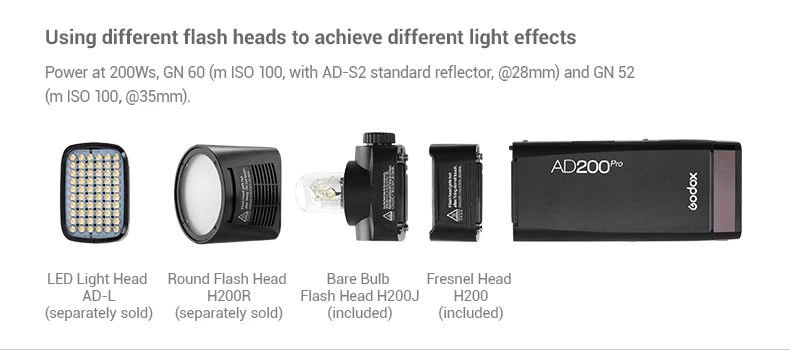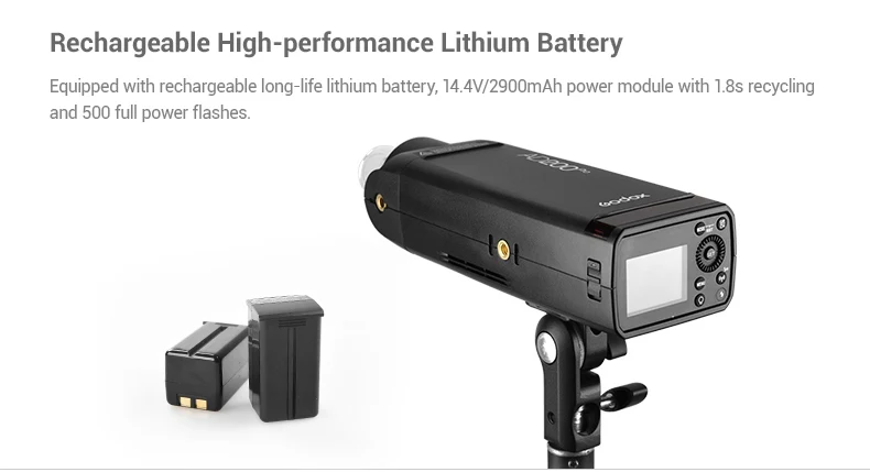 2) большой Ёмкость литий Батарея: Godox AD200 Pro предлагает 500 полный Мощность вспышки с 0,01 до 2,1 сек. Переработки. Расширенный Ручной 9 стоп диапазон регулировки мощности от полного до 1/256 с шагом 1/10 стоп