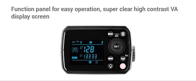 5) легкий портативный простой в использовании: простые в использовании кнопки обеспечивают полный спектр функций, таких как надежное срабатывание каналов, селективность группового режима, HSS. ЖК-панель четко отображает состояние всех удаленных стробов, поэтому у вас всегда есть контроль установки группового освещения