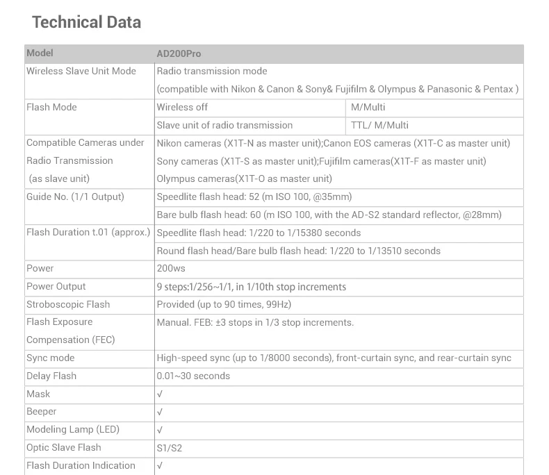 3) управление 2,4G с диапазоном 330Ft: Godox AD200Pro поддерживает Nikon, Canon, Sony, Fujifilm, Olympus, Panasonic и Pentax TTL. С функцией Master & Slave, AD200Pro может использоваться в сочетании с вспышками Godox TTL, вспышками TTL на открытом воздухе и т. д.