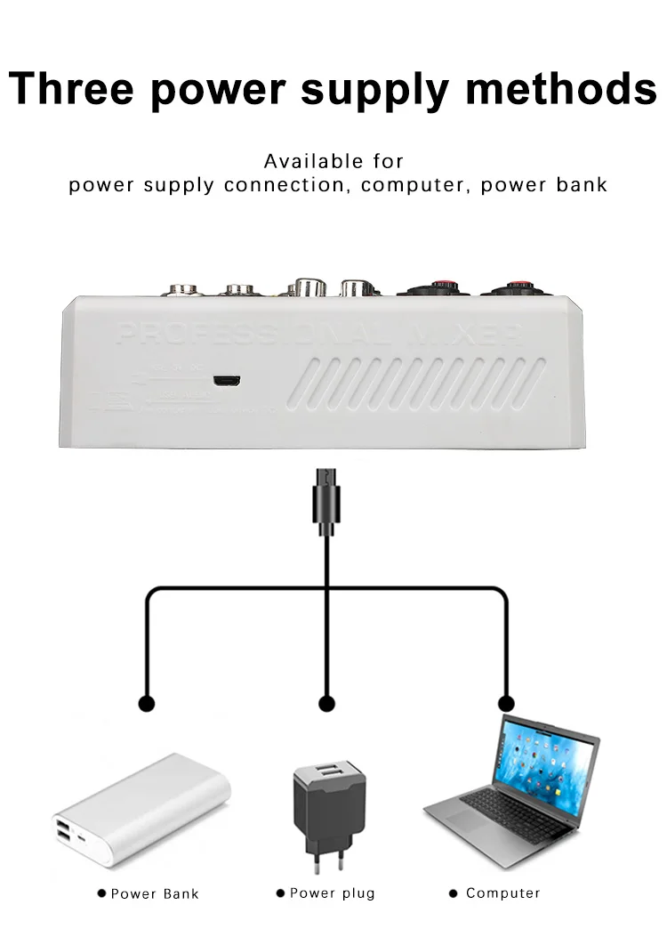 【Зарядка micro-USB/48 В фантомная мощность 】 разработан с портом micro USB, миксер BOMGE BMG-04D может быть оснащен компьютером, адаптером питания и блоком питания, обеспечивая 48В Мощность для микрофонов XLR Сделано в Китае штепсельной вилки. Зарядка и передача данных одновременно. При подключении к компьютеру миксер может оптимизировать голос компьютера через функцию звуковой карты.