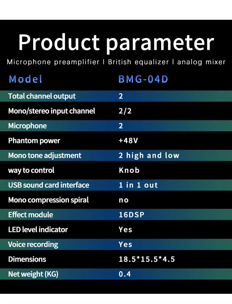 【Digital Effect capability】с реальным цифровым эффектом множество кнопок настройки, BOMGE BMG-04D миксер поддерживает высокий шаг, басы, реверберации, Входное усиление, регулировка громкости и мониторинг звука в реальном времени. Управляемые эффекты реверберации EFX делают музыку более полной. Низкий уровень шума, высокоточный усилитель микрофона с идеальным качеством звука.