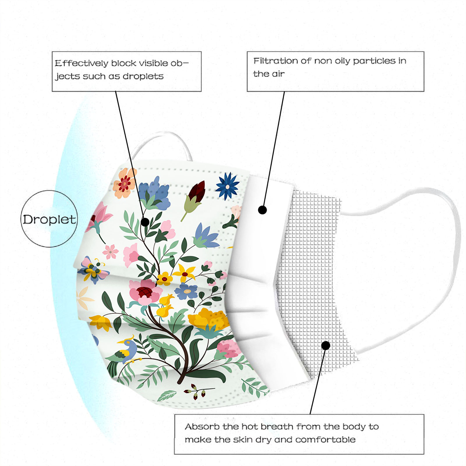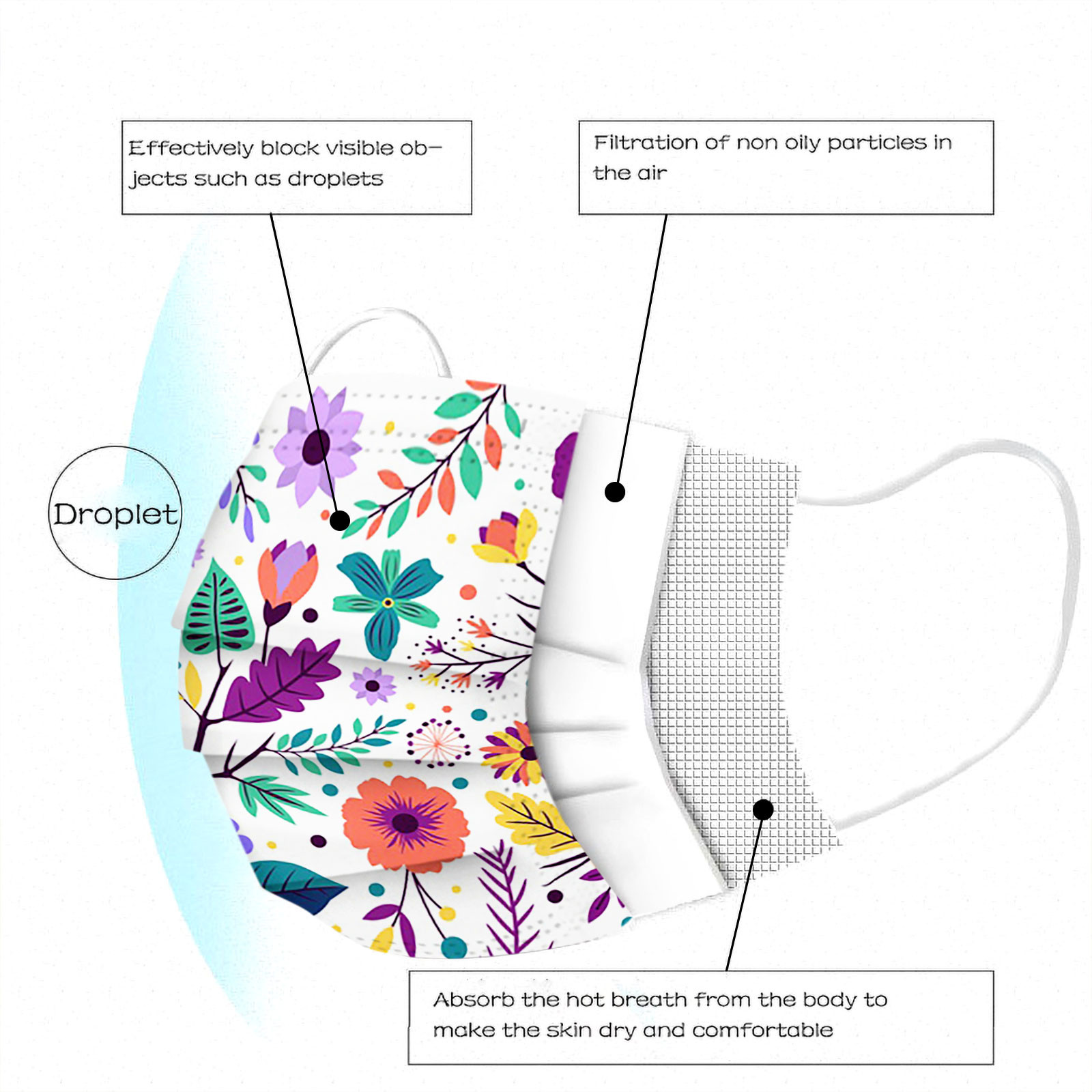 The 3 ply non-woven disposable mask is made of 3 ply non-woven material, it is healthy and safe for you to use. Breathable material and cute patterns, which makes it useful and fashionable. Special 3 ply non-woven design, provides some protections against dust, automobile exhaust, pollen, etc. Elastic ear loop, easy to wear and no pressure to the ears. nail salon or any other areas where protection might be required