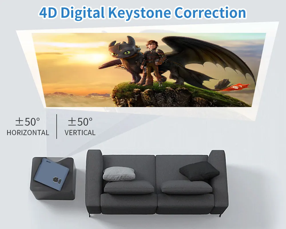 Проектор имеет цифровую коррекцию keystone 4d, вы можете настроить изображение под наиболее подходящим углом. Проектор имеет коррекцию keystone ± 50 °, вы можете использовать проектор для просмотра фильмов.