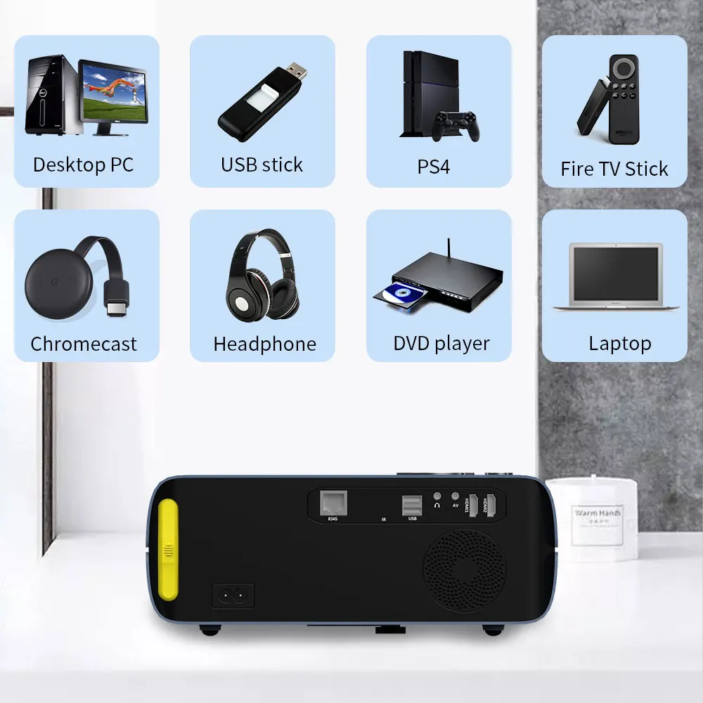 Проектор имеет blue-tooth 5,0, его можно использовать в качестве устройства blue-tooth. Вы можете использовать его для подключения к динамику, наушникам, проектор имеет высокое качество звука. Вы можете использовать его для прослушивания музыки.