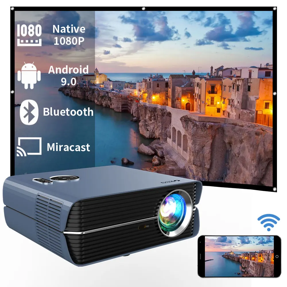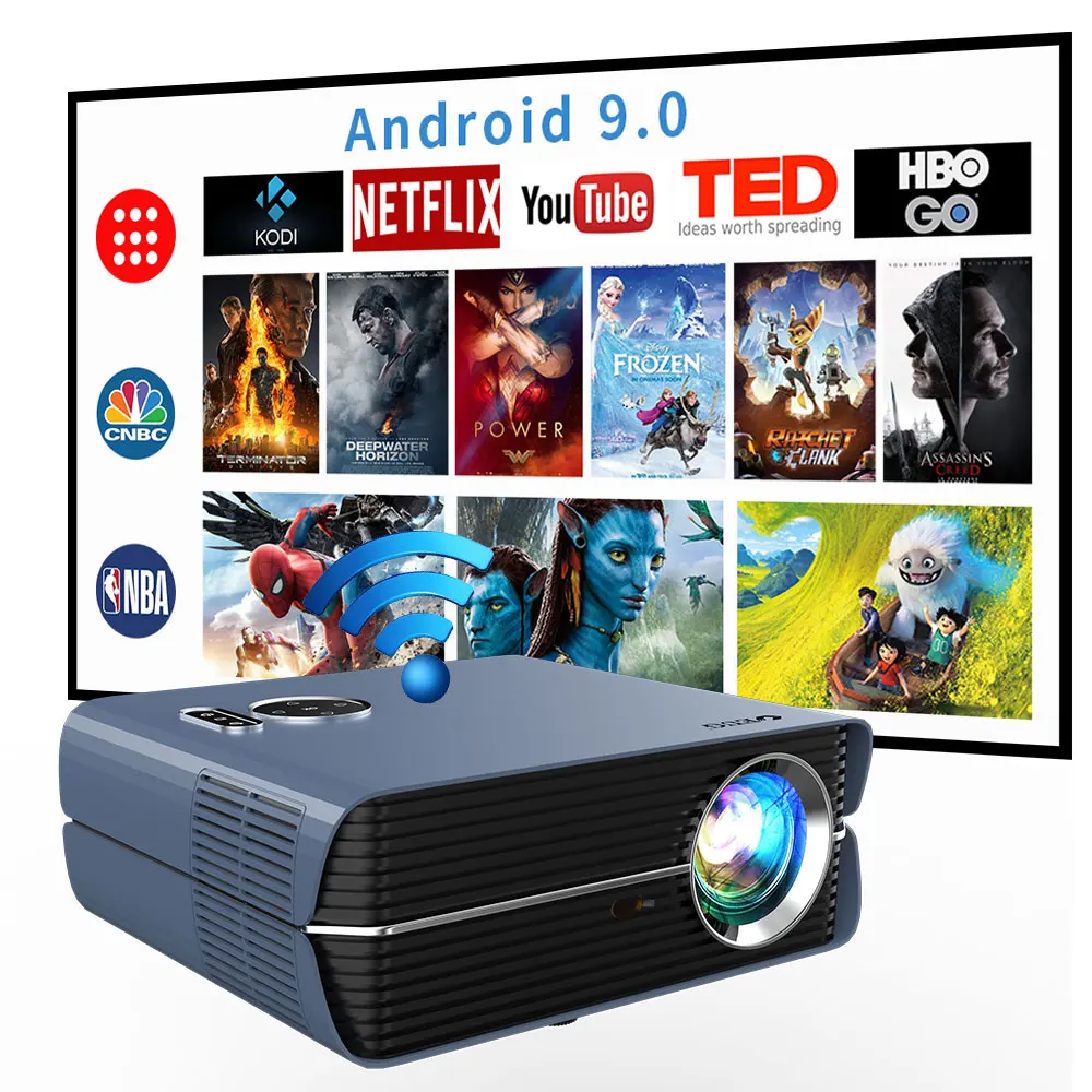 Проектор имеет оригинальное Разрешение 1080p, поддерживает blue-tooth.The лампа имеет более 50000 часов работы, имеет 6000 люмен. Проектор имеет систему android 9,0, он может проектировать на 200 'большом экране. Поддерживает беспроводную airplay.