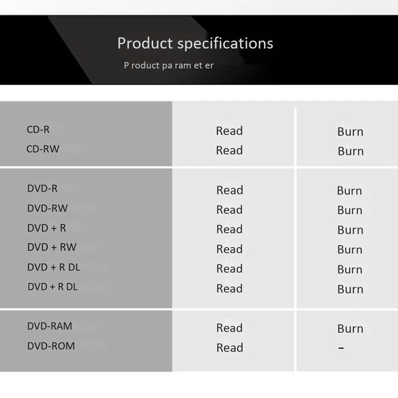 Описание:[PLUG & PLAY]Не требуется драйвер и внешняя мощность, питание от usb-порта. Внешний CD / DVD диск может использоваться для просмотра DVD фильмов, прослушивания музыки, создания резервных дисков, записи фильмов/музыки, установки системы.