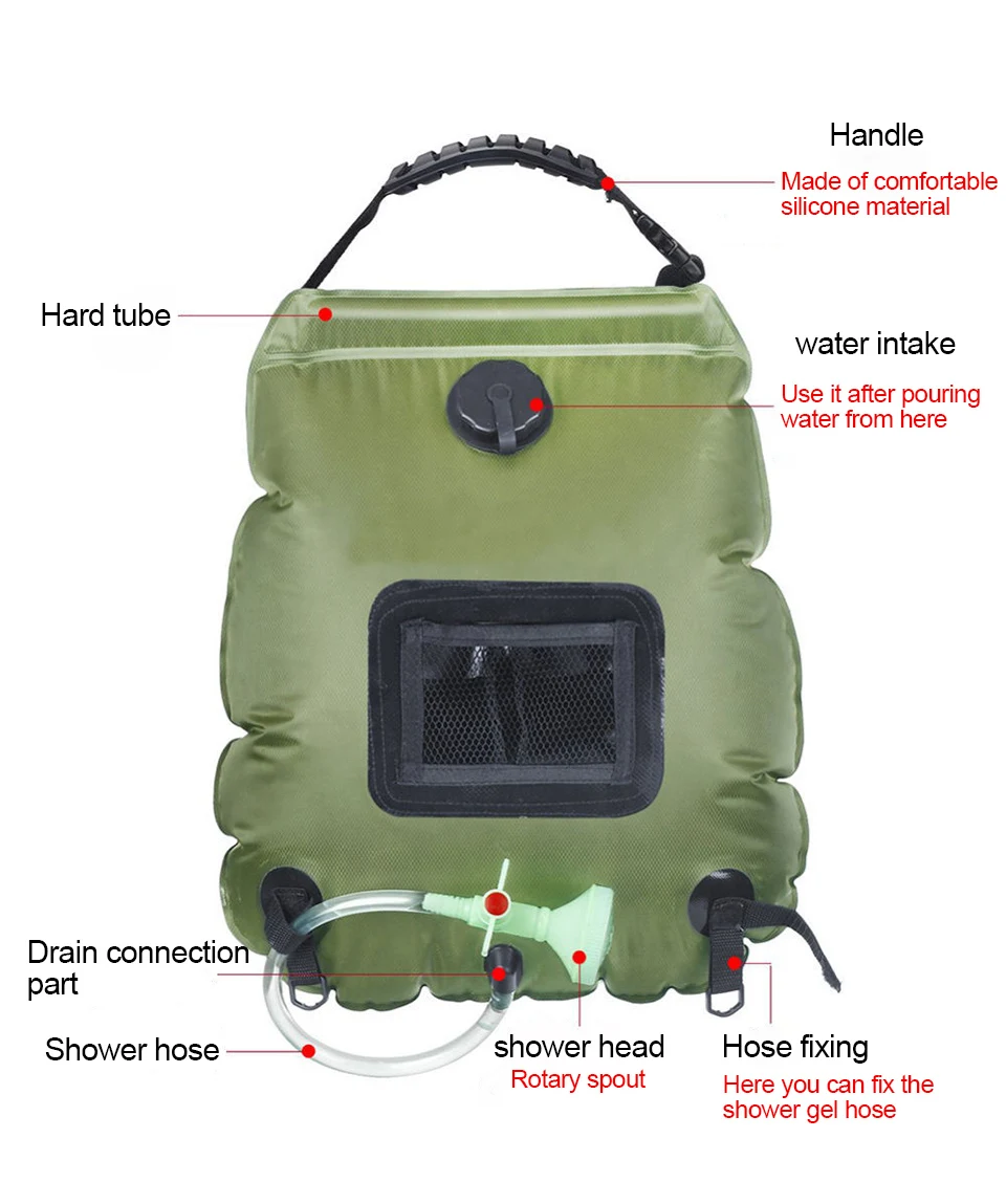 Емкость воды 4,20 л/5 галлонов: Эта портативная душевая сумка может удерживать до 20 л/5 галлонов воды для душа на открытом воздухе, которая может непрерывно купаться в течение 8-10 минут, идеально подходит для кемпинга на открытом воздухе, пешие прогулки, альпинизма, самостоятельное вождение, рыбалка или охота. Это лучший подарок для мужа, жены, отца, сына, дочери, друзей, коллег и любителей активного отдыха, их идеальный аксессуар для улицы.