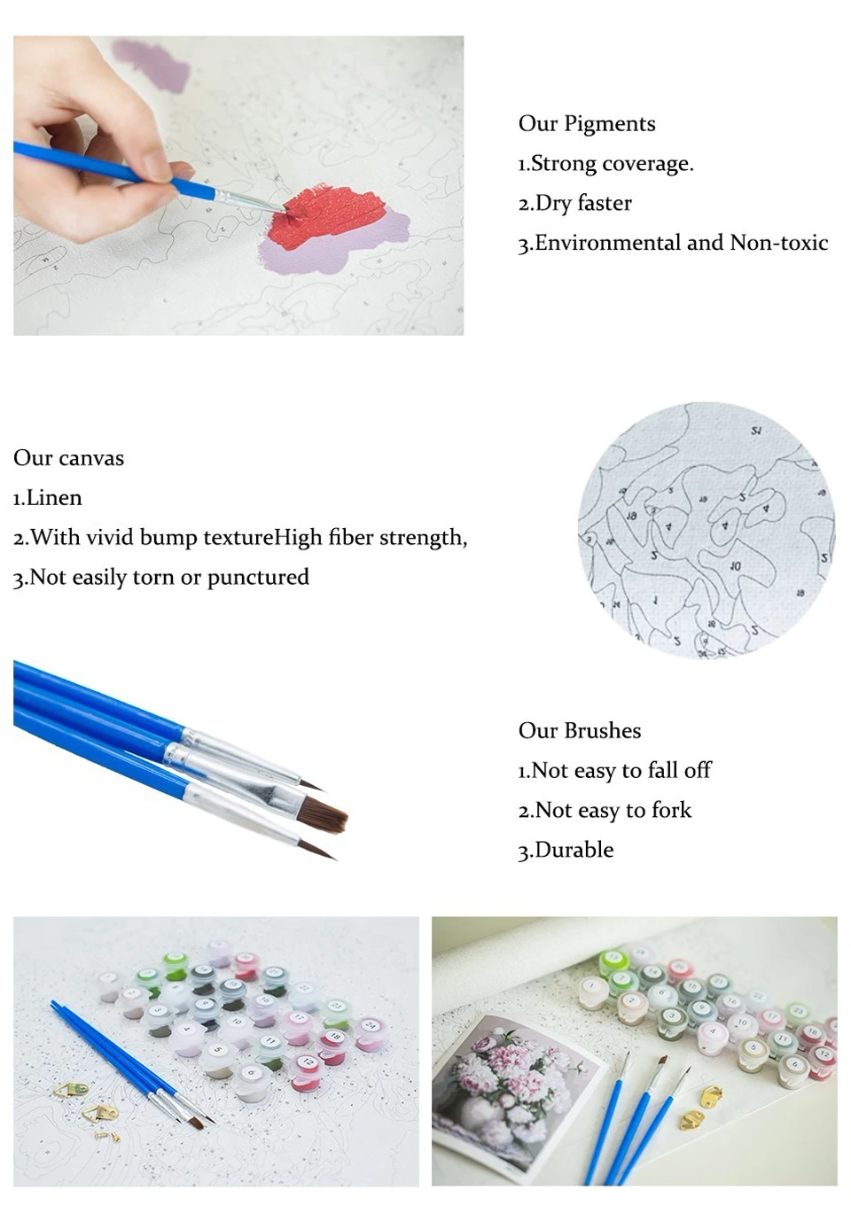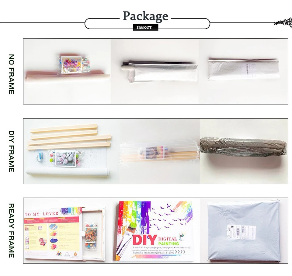Льняной холст; 3 кисти; 1 Набор акриловой краски; Файл инструкции; Справочный лист; Рамка; Вешалка; Винты