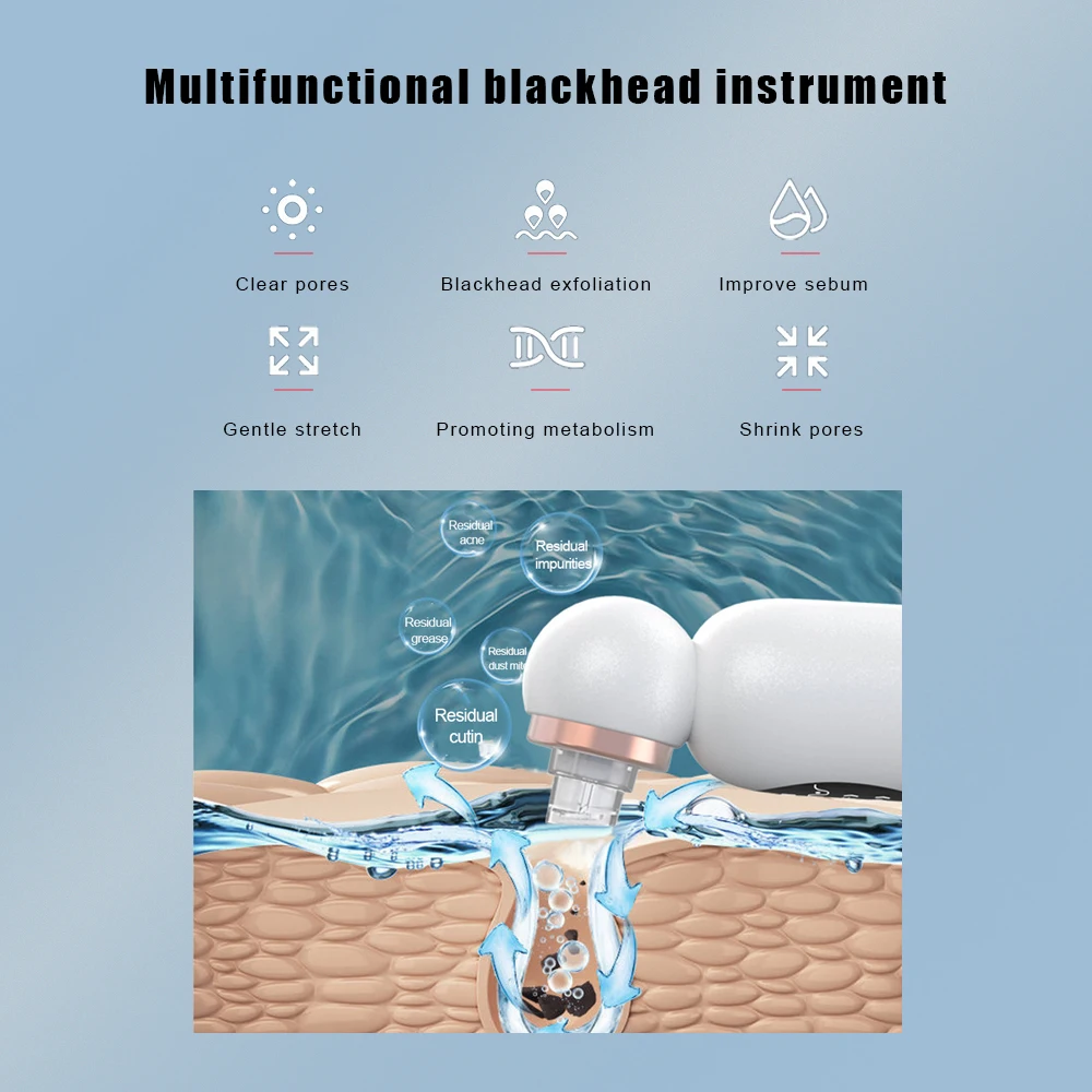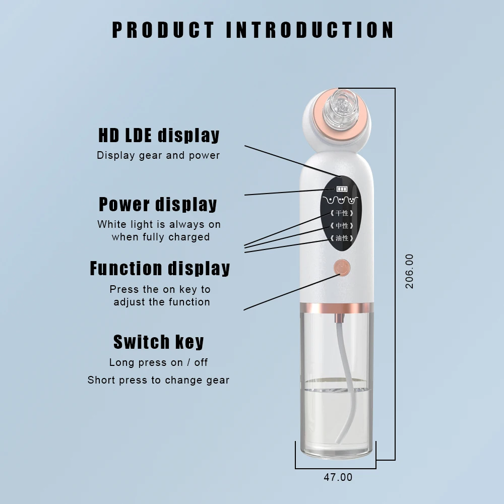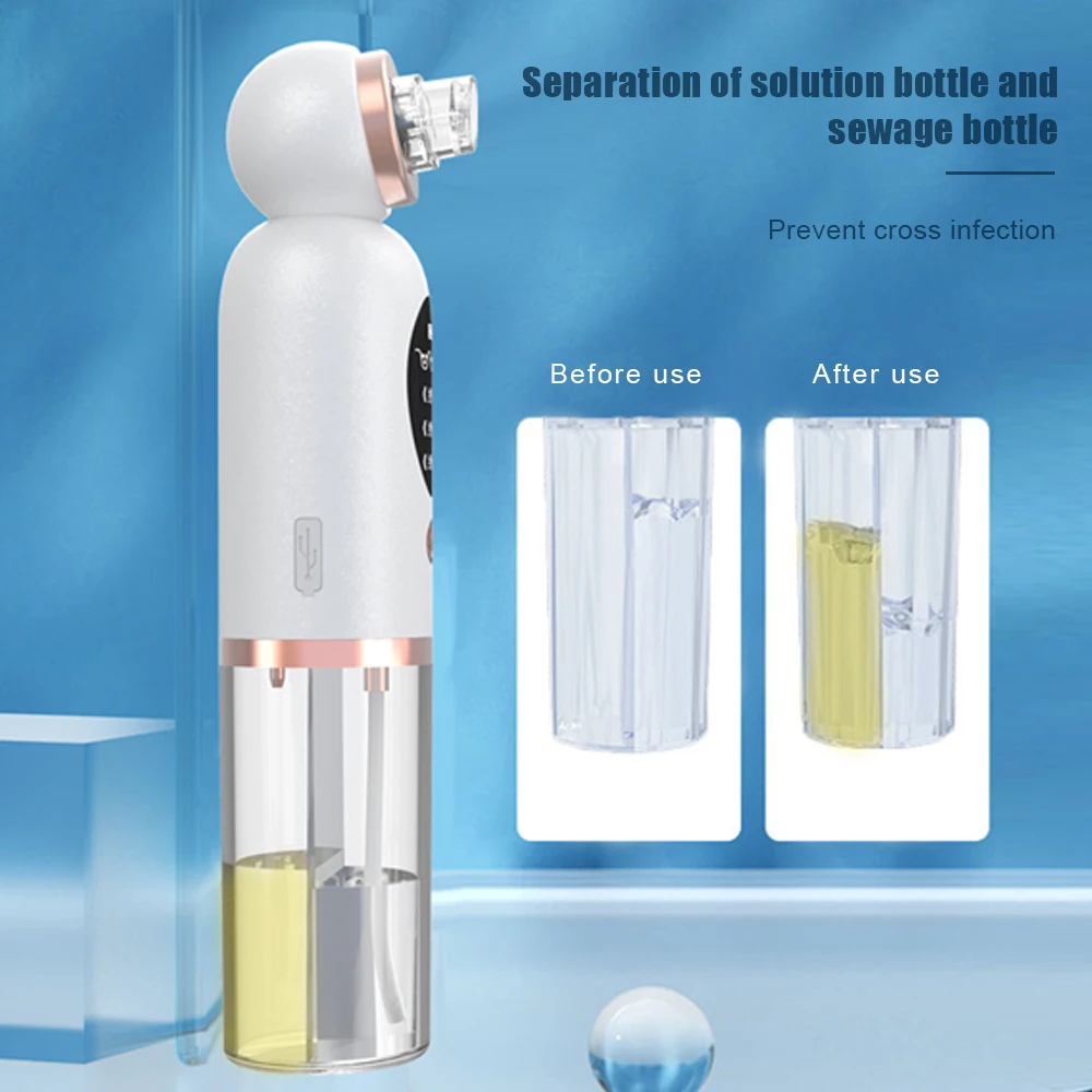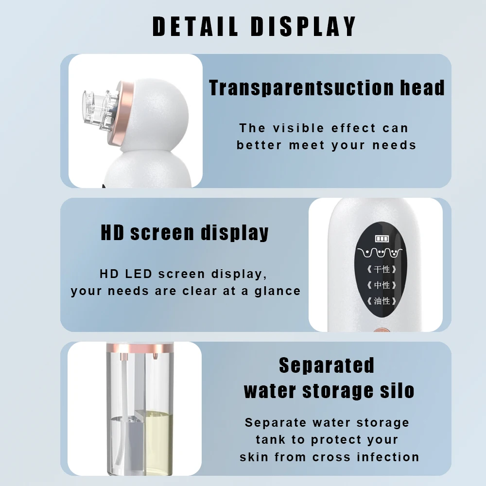 Принимает вакуумную технологию водного цикла отрицательного давления, распыляет раствор из центра рабочей головки, непосредственно в глубокие поры, растворяет кожное сало, смягчает кутин, восстанавливает влагу кожи, высасывает черные головки, омертвевшая кожа и примеси в порах, сброс отходов снаружи рабочей головки, способствует циркуляции, Ускоряет обмен веществ. Сделайте вашу кожу упругой, нежной, эластичной и омолаживаемой.