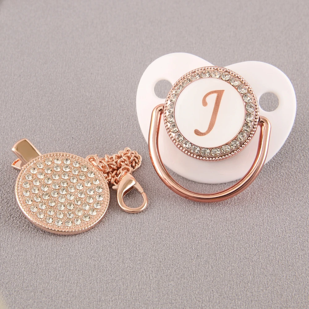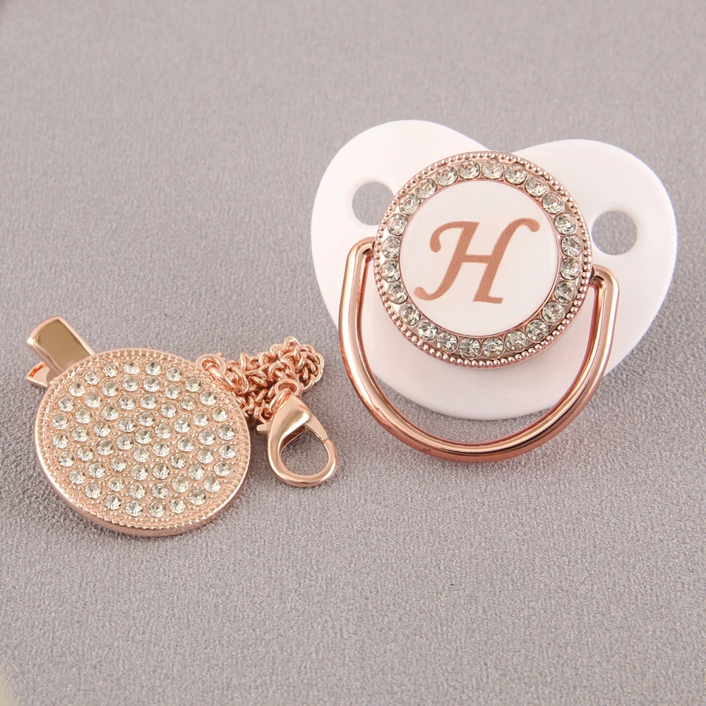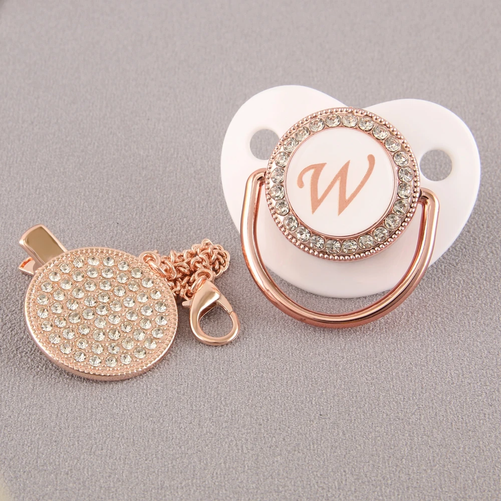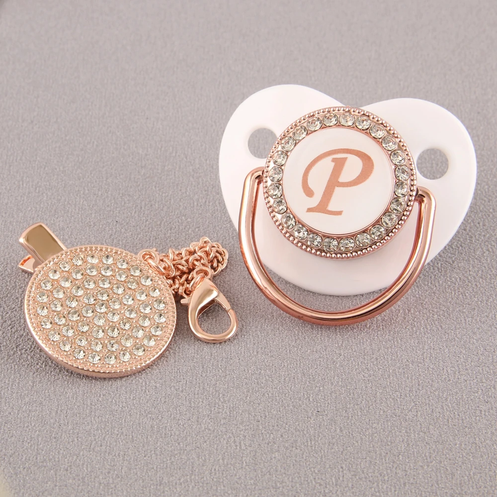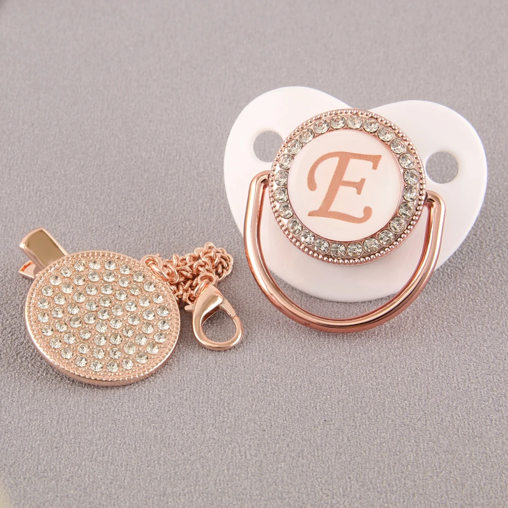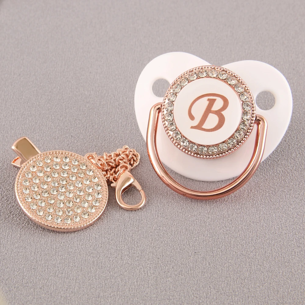 26 наименований, пустышка и клипсы для малышей с надписью, Силиконовая пустышка для младенцев, розовое золото, блестящая пустышка для новорожденных