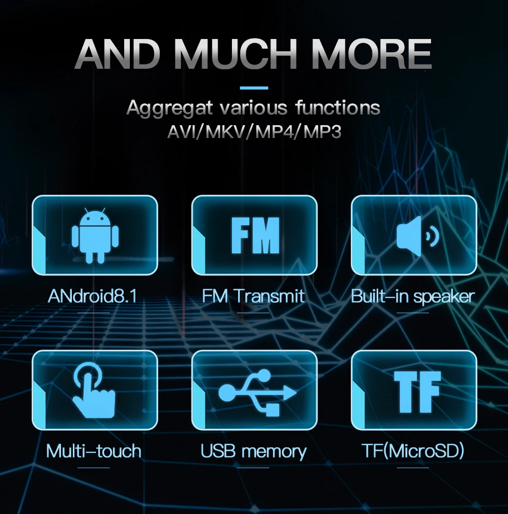 Функция:Система: Android 8,1 четырехъядерный 3G/4GОЗУ: 2 ГбПЗУ: 16 ГбВход:Сенсорная панель: Пять точечный колпак-сенсорный экранКлавиши панели: 3 кнопки: питание, Громкость +, громкость-,Камера: фронтальная: 2 МП для F ront камерыМикрофон: ПоддержкаВыход:ЖК-дисплей: IPS:1280X800 пикселейДинамик: Встроенный 8/1 Вт динамикДля наушников: 3,5 мм наушники Порты и разъёмыРазъемы: 1xTF слот 1xUSB портХранение:TF карта | До 128 ГБКоммуникация:Синий зуб: ДаМодуль 3G: Да, поддержка: GSM850/900/1800/1900,WCDMA2100GPS Modual: ДаWifi модуль: 802,11 b/g/nФормат аудио:MP3/AACIAAC +/WMA/DRA/AMR-NBФормат видео:H.264 1080p 30 кадров в секунду, H.263720p 30 кадров в секунду, MPEG-4 1080p 30 кадров в секунду, вспышка 1080p 30 кадров в секунду, RMVB 1080p 30 кадров в секунду, H264 стерео 720p 30 кадров в секундуФормат изображения:JPG,JPEG,GIF,BMP,PNGЯзыки:Поддержка нескольких языков