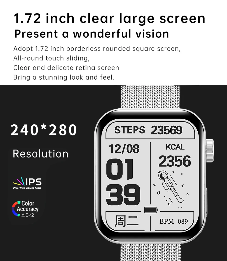 Ознакомление с часами: Экран: 1,48 "240*240 полноразмерный сенсорный экран Аккумулятор: 220 мАч полимерный Размер упаковки: 15,1*7,5*3,0 см Bluetooth: 4,0 Поддержка мобильной версии: iOS 9,0 и выше Android 5,0 и выше Особенности: Входящий вызов/SMS содержимое push Напоминание о наличии функции включения переключателей на стороне приложения (входящие звонки, текстовые сообщения, Wechat, QQ, Facebook, Twitter, LinkedIn, WhatsApp, Line, Instagram, Snapchat, skype и другие мобильные приложения) и события, такие как сидение, будильник, питьевая вода, принятие лекарств, И т. д. Напоминание информации, будильник, фото, поднятый экран запястья, напоминание о сидячем положении, секундомер, обратный отсчет, поиск мобильный телефон, регулировка яркости браслета, регулировка продолжительности экрана браслета, подсчет шагов, поддержка приложения для синхронизации данных сердечного ритма, упражнений, пробега, калорий, шагов, сна, полного сна, глубокого, Светильник, запись истории, пульс, кровяное давление, сон, упражнения Язык поддержки: Интерфейс браслета поддерживает английский, упрощенный китайский, французский, немецкий, итальянский, испанский, русский, португальский (поддержка многоязычных сообщений)