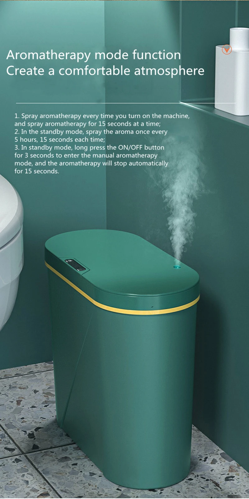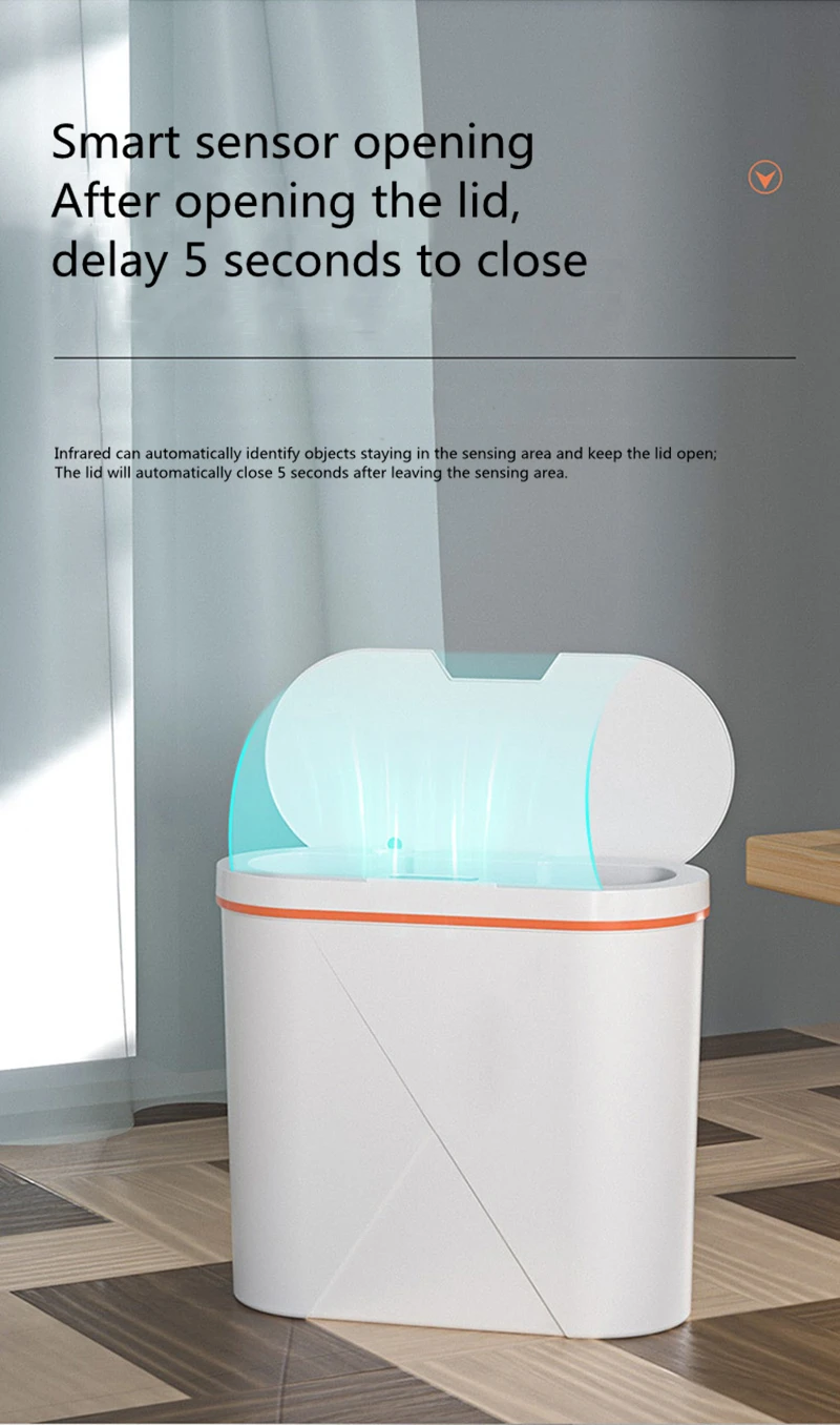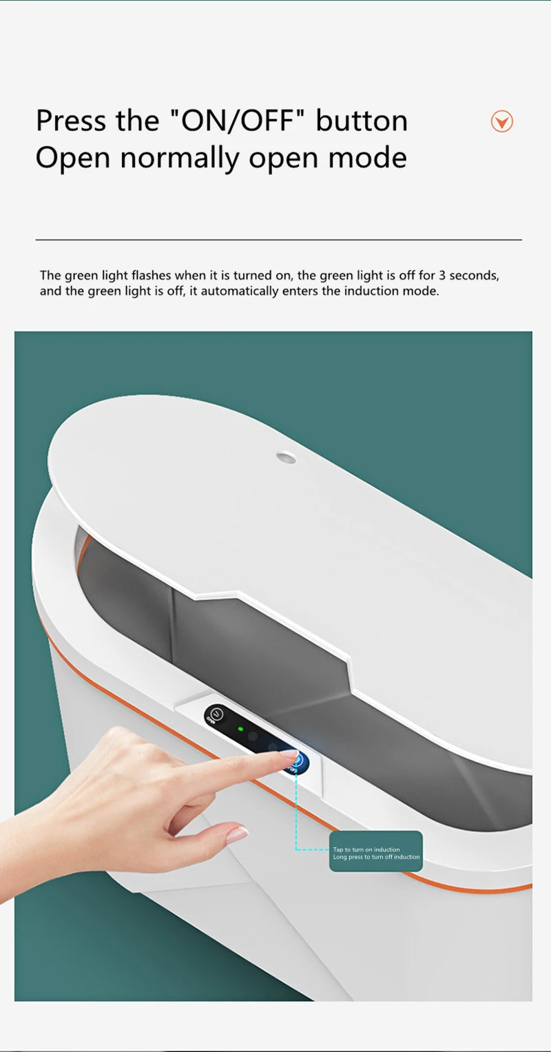 4. Инфракрасная индукция: Поместите руку на 10-20 см над индукционной областью. Крышка открывается автоматически и закрывается автоматически через 5 секунд.