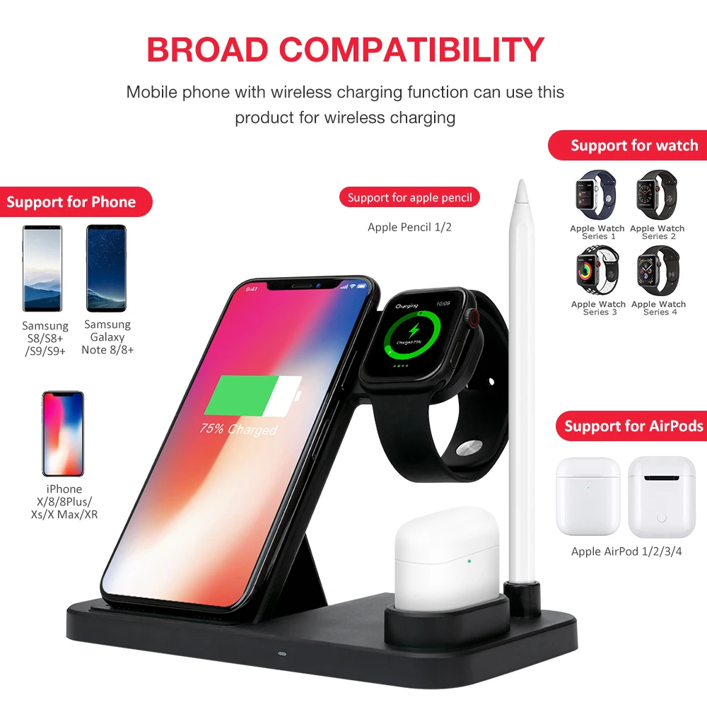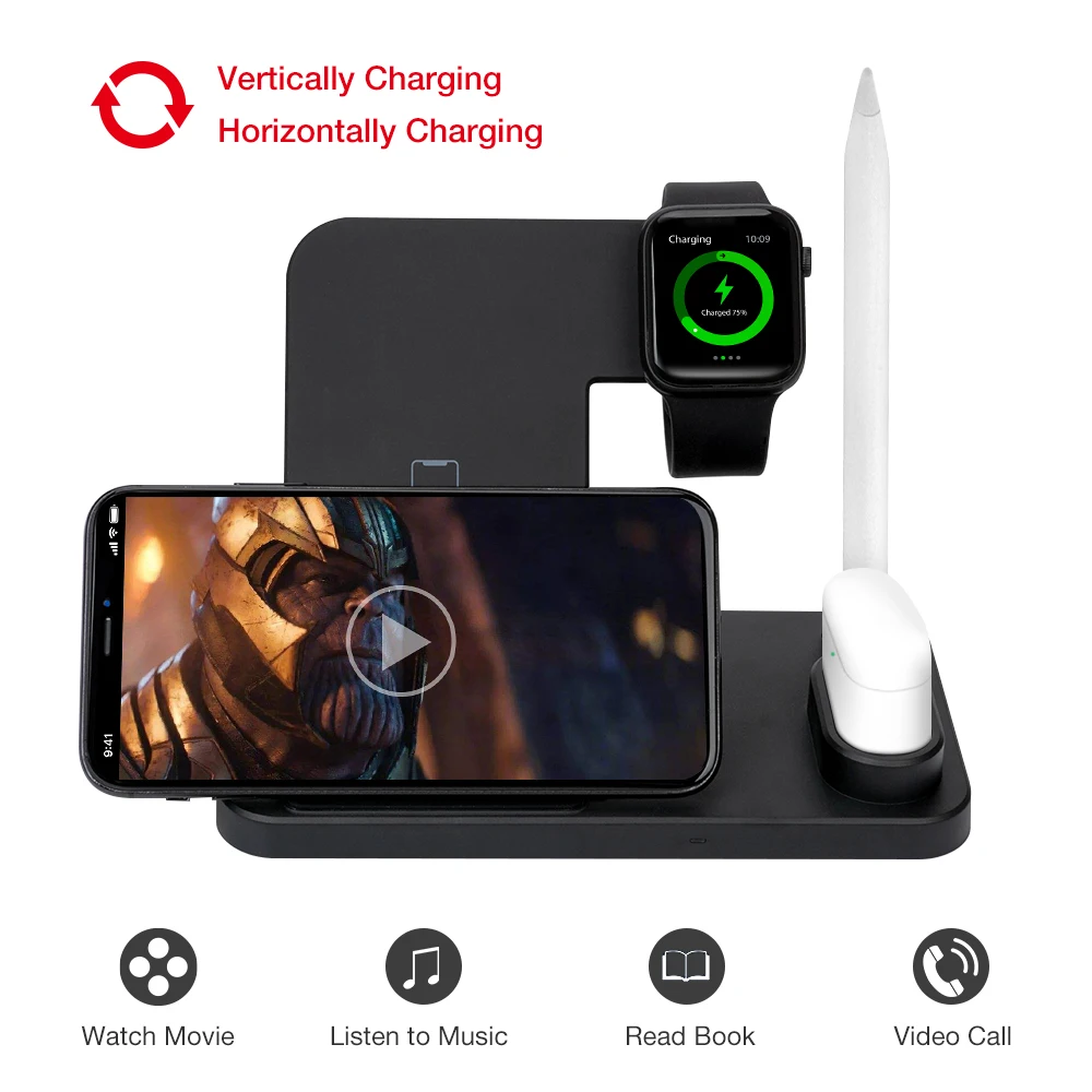 Это Беспроводное зарядное устройство 4-в-1 поддерживает Apple Watch 1/2/3/4/5/6, наушники 1/2/3, Apple Pen1. Он может заряжать телефон, Смарт-часы, наушники и ручку apple одновременно, чтобы сэкономить ваше время.