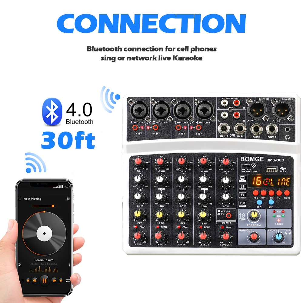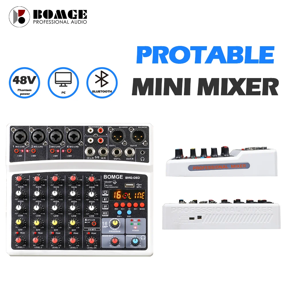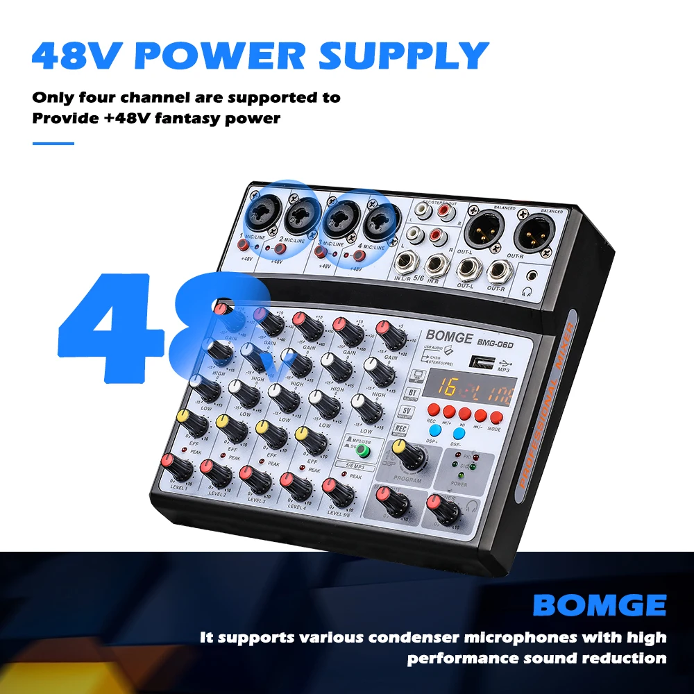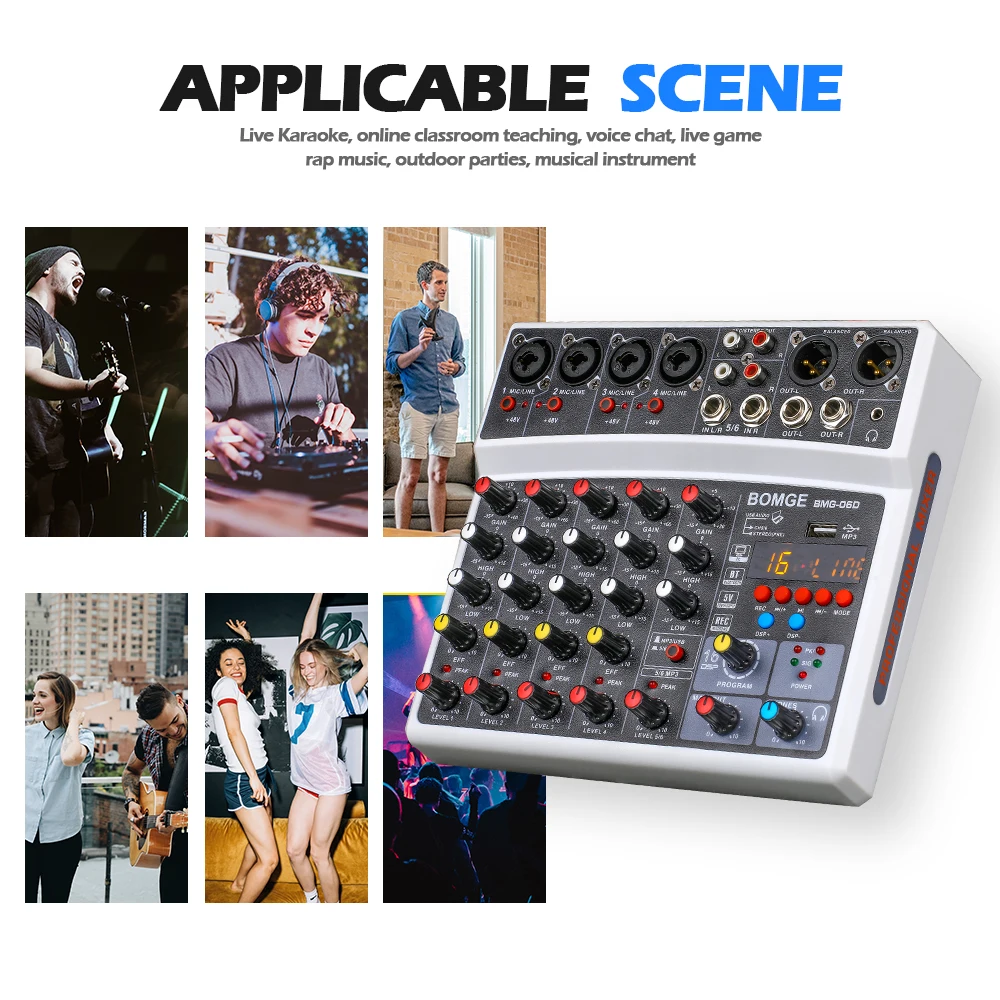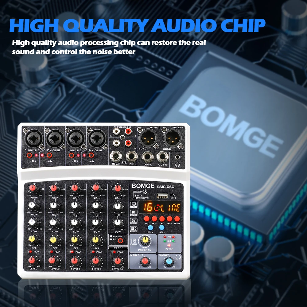 В BOMGE BMG-06D смеситель является многофункциональным 6-канальный микшерный пульт с звуковая карта и встроенный BMG дизайн эффект чип, которые могут удовлетворить потребности домашний музыкальный производства и трансляции пользователей, прямая трансляция, караоке, голос, выступления небольших групп и т. Д.