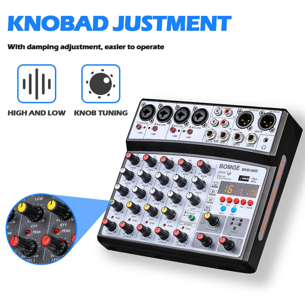 1. DSP функция эффекта-BOMGE Профессиональный 6-канальный смеситель имеет встроенный 16 DSP эхо/отложенный сигнал звуковой эффект процессор, который создает больше возможностей для любых жанров музыки и предлагает различные изменения для того, чтобы ваш звук. Например, он используется для изменения голоса во время прямого эфира и записи дубления.