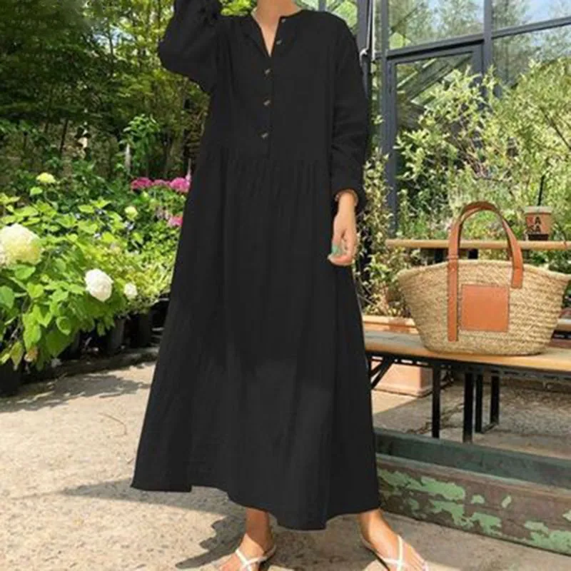 Женское платье, рубашка, юбка, весна и осень, Простой чистый цвет, хлопок и лен, длинное, большое, свободное платье-рубашка, дышащее, размера плюс