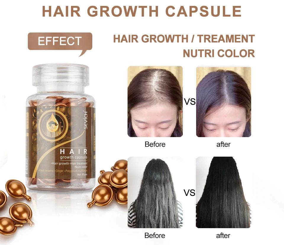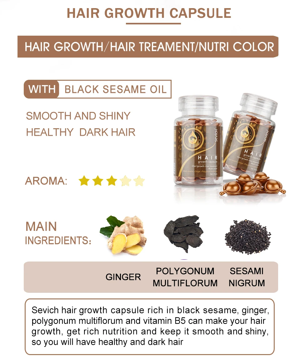 Богатый кунжутом, имбирем, многоцветным полигоном и витамином в5, капсулы для роста волос помогут вашим волосам расти, получить богатые питательные вещества и сохранить их гладкими и блестящими, оставив ваши волосы здоровыми и черными.