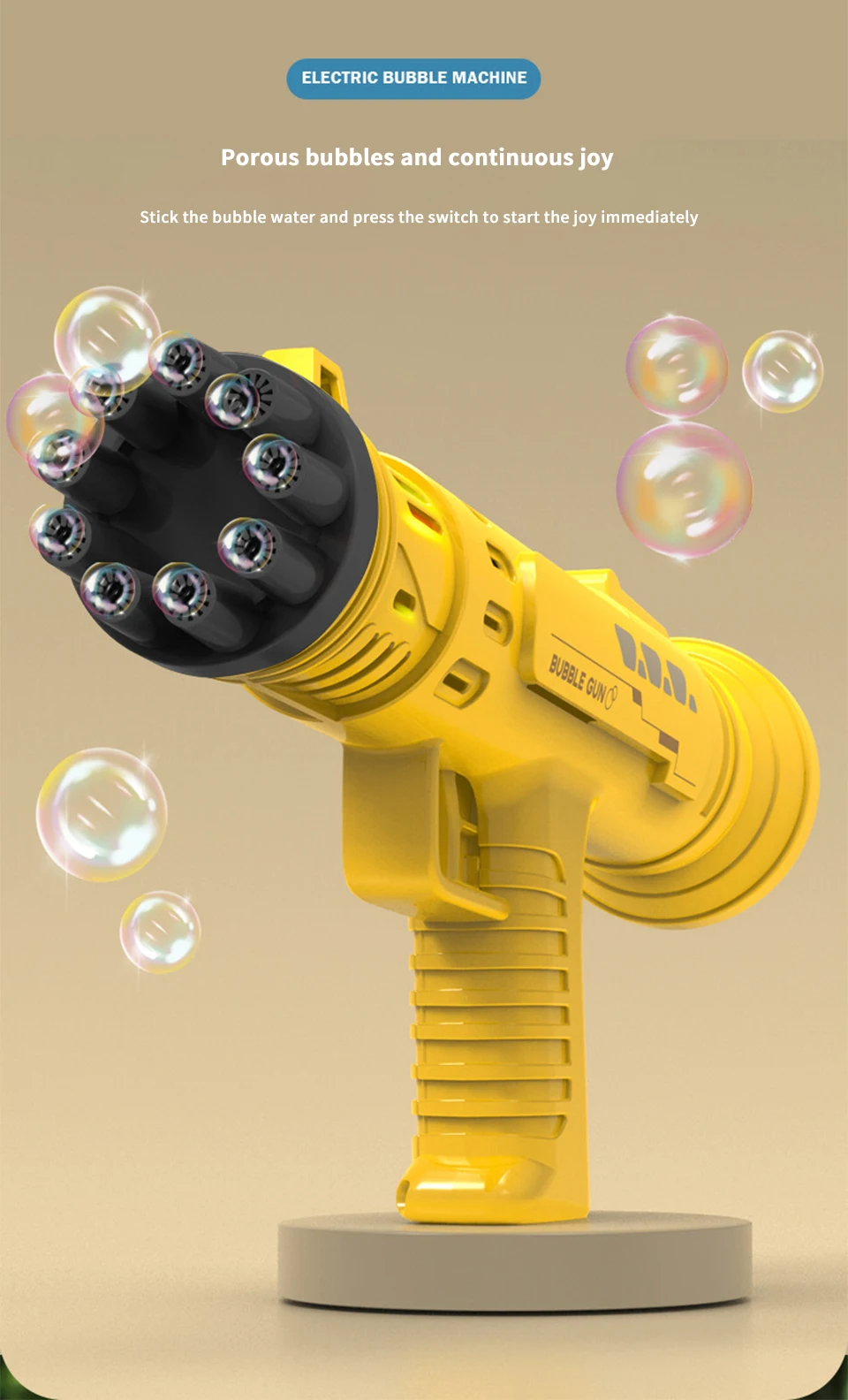 3. Материалы для детей: игрушки-машины Gatling bubble изготовлены из безопасного, высококачественного АБС-пластика, безопасного, прочного, герметичного, герметичного, круглого дизайна, без острых краев и неприятных запахов и пузырей. Не нужно беспокоиться о том, что ваш ребенок был ранен. Дети могут безопасно использовать его и наслаждаться забавой пузыря.