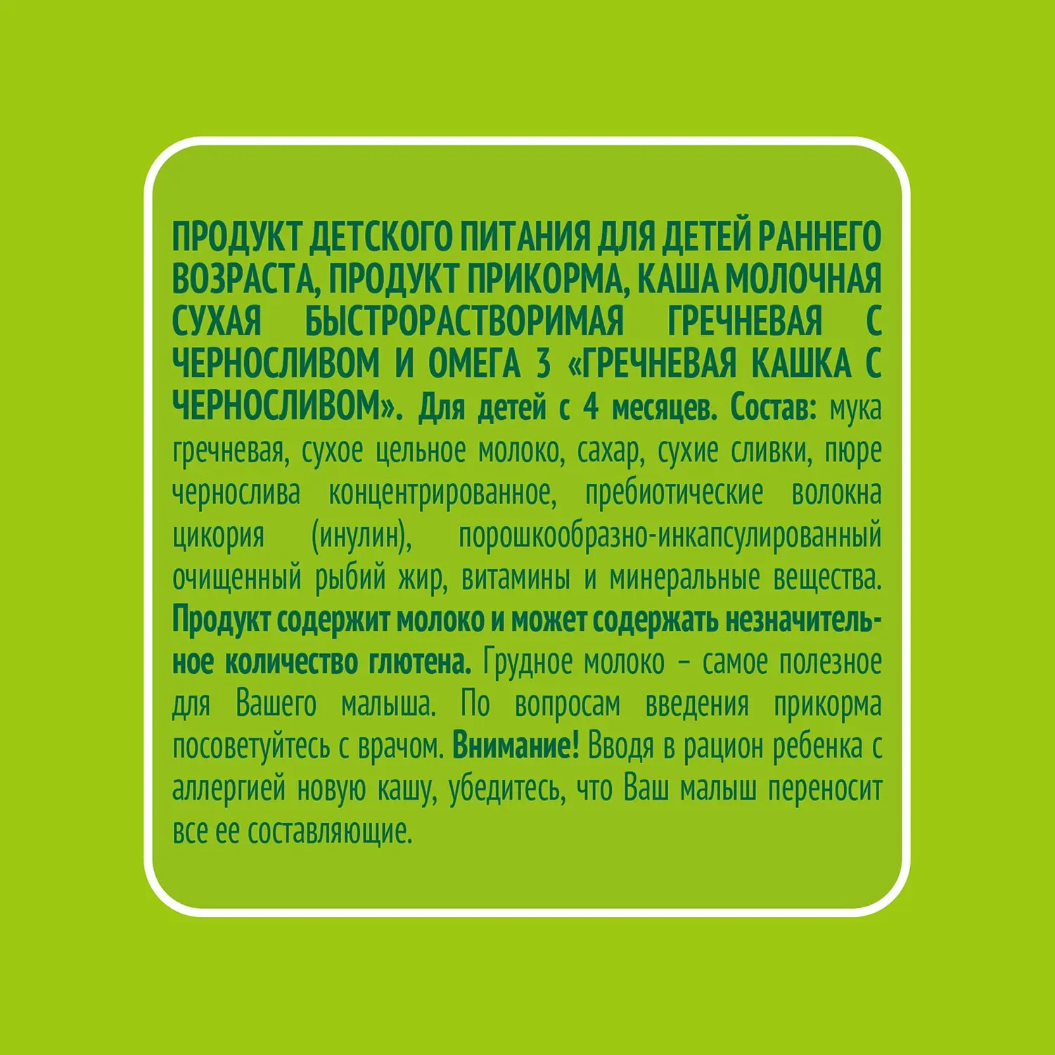 Молочные гречневые каши «Хайнц» имеют высокую питательную ценность и содержат растительные белки, необходимые для нормального роста. Чернослив поддерживает работу кишечника, предотвращая запоры. В состав молочных кашах входит Омега-3, которая стимулируют работу мозговых клеток и укрепляют иммунитет.
