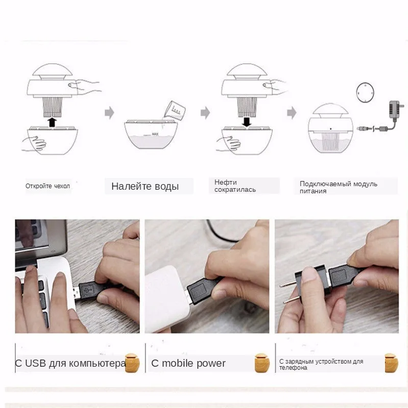 Как использовать? 1. Кнопка «светильник» нажмите сначала: Включите светодиодный светильник, цвет меняется автоматически 2. Нажмите второй: Выберите один из цветов светодиодный светильник, который вам нравится 3. Кнопка MIST нажмите сначала: непрерывный туман, выходящий, нажмите непрерывно, чтобы выбрать материал времени: ABS + электронные компоненты. Размер: 9,7x9,7x9,7 см/3,82x3,82x3,82 дюйма (Д x Ш x В). Цвет: темное дерево. Примечание: 1. Обязательно используйте мягкое моющее средство, если вы хотите очистить увлажнитель. 2. Не заполняйте воду по максимальной линии в любое время. 3. Не включайте питание, когда бак пуст. 4. Регулярно чистите в соответствии с инструкцией по обслуживанию, чтобы избежать неисправности. 5. При использовании в первый раз, подождите 3-5 минут, потому что ватные тампоны не полностью влажные. 6. На 100 мл воды предлагается добавить 2-3 капли эфирного масла. Инструкция по техническому обслуживанию: 1. Добавьте небольшое количество теплого кухонного моющего средства. 2. Очистите водой. 3. Используйте тампон, чтобы аккуратно протереть, а затем используйте чистящую ткань для легкой сушки.