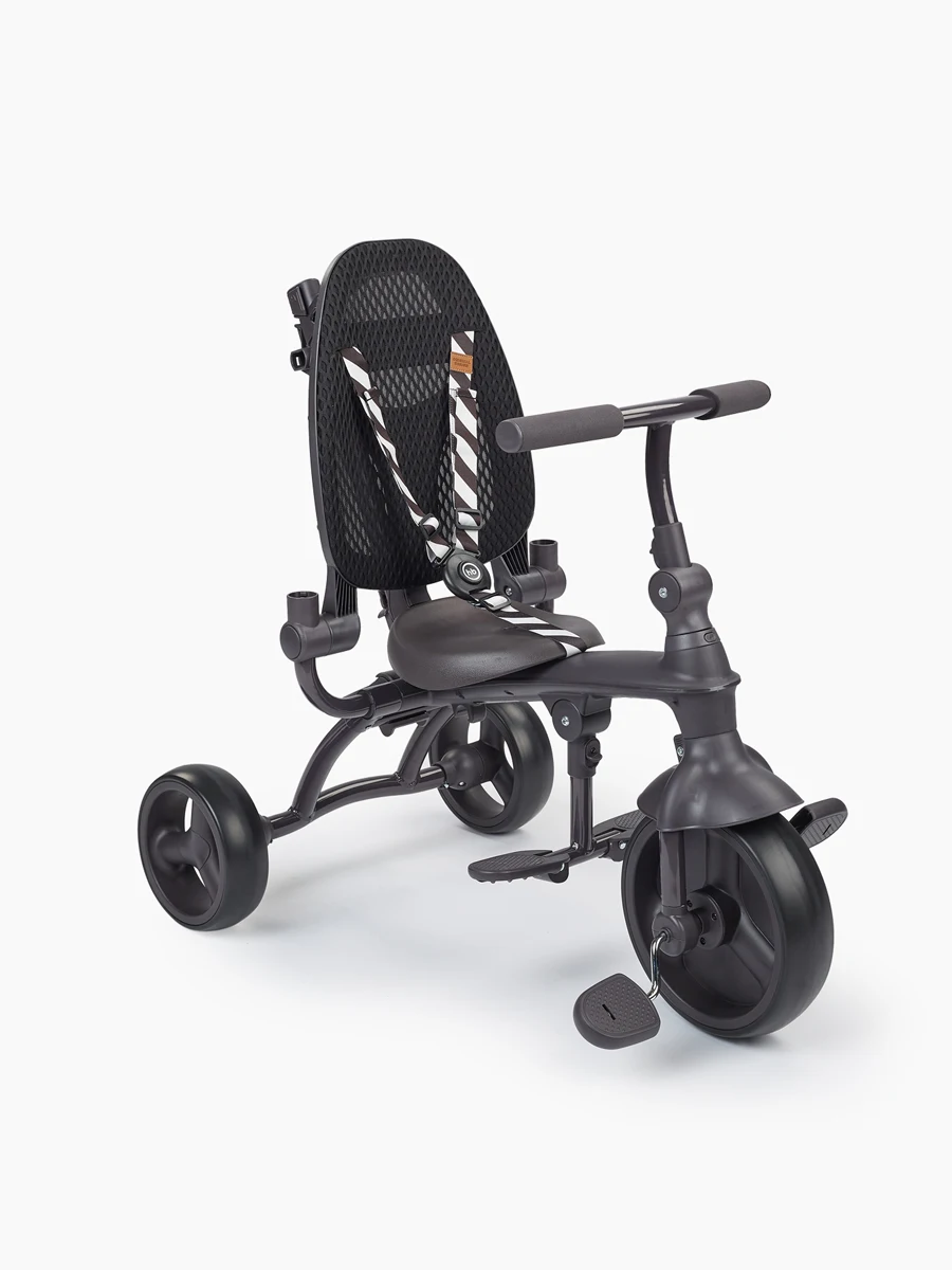 Ребенок будет чувствовать себя комфортно в удобном сидении с высокой спинкой и складными подножками, а складной навес защитит от солнечных лучей и небольших осадков. Мягкая оправа-ограничитель сделает прогулки безопасными.
