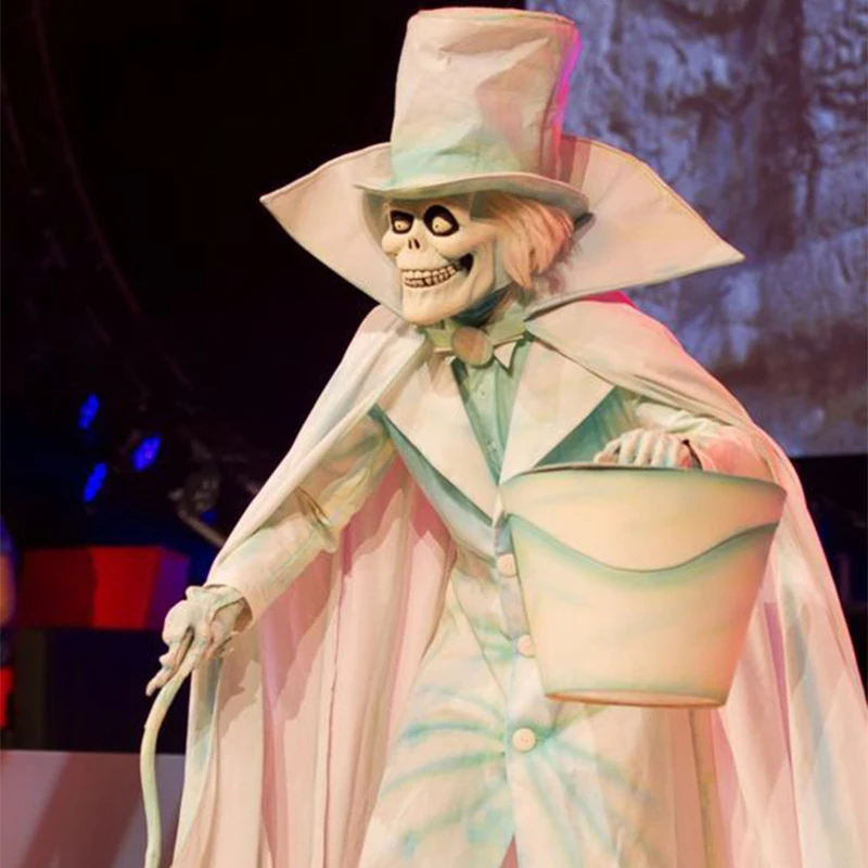 Голова Призрака была освещена черным светом. Светильник внутри шляпного ящика, в котором он держал, ритмично освещал и прятал голову в шляпный ящик, а в тандеме, настоящая голова на плечах призрака будет спрятана, погасив черный светильник.