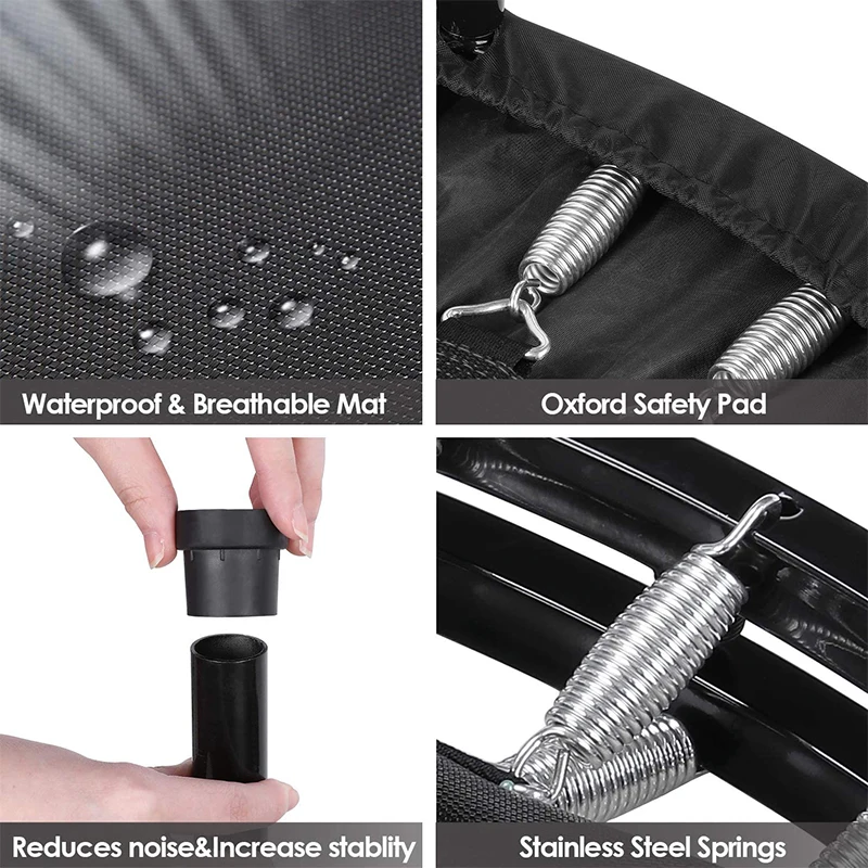 В комплекте: коврик для прыжков, защитная сетка и колпачки для столбов, черные столбы и поролоновые накладки, двусторонняя пружинная защитная пена и лестница.
