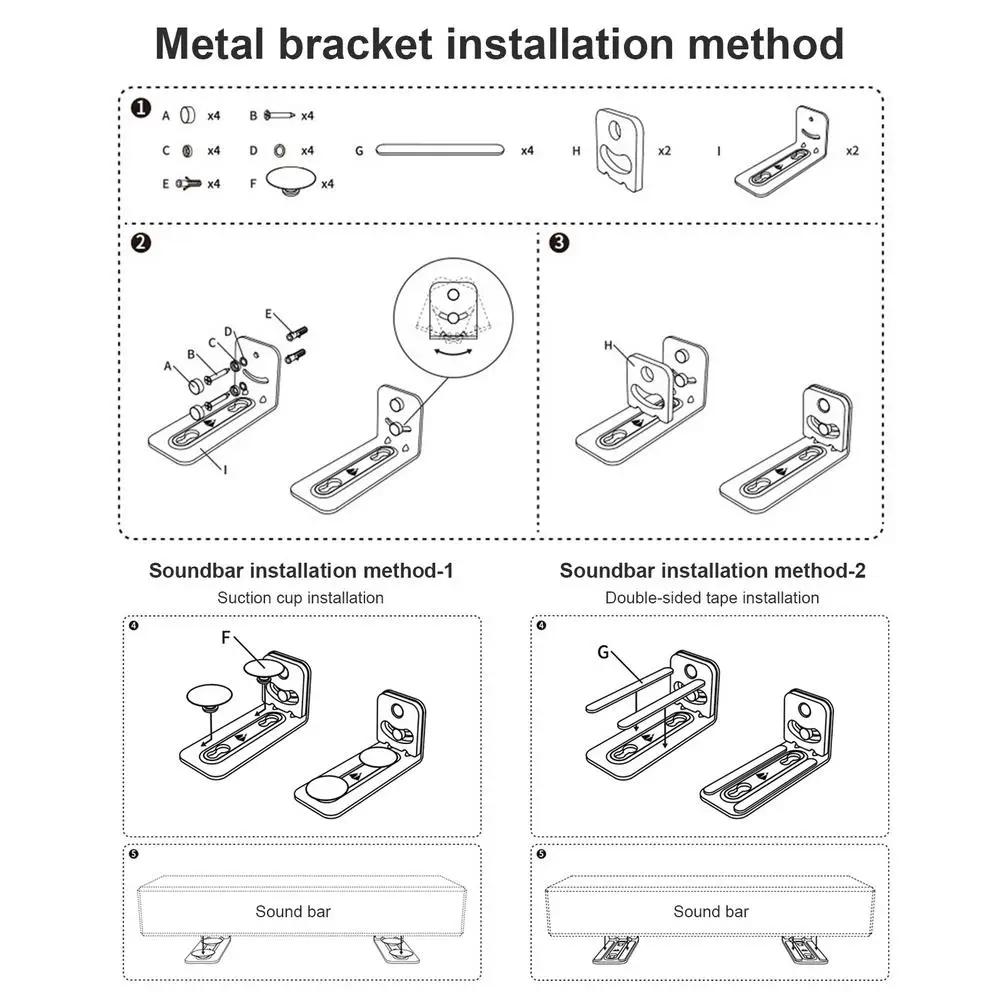 4. Нескользящая конструкция: кронштейн имеет присоски 4r и 4 двухсторонние ленты, чтобы крепко держать звуковую панель и держать звуковую панель от падения. Присоска может быть повторно использована, и двухсторонняя лента легко снимается без каких-либо царапин.