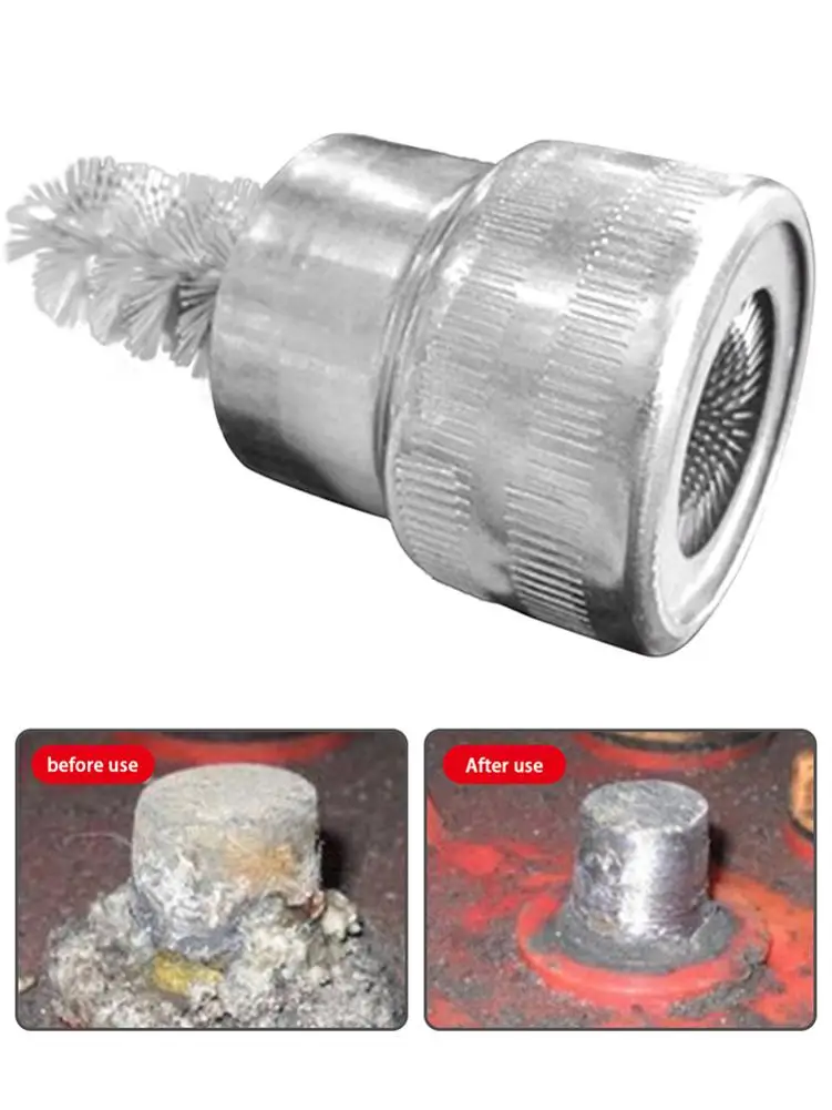 Кисть изготовлена из стальной проволоки. Внутри и снаружи есть две стальные щетки, которые специально используются для очистки окисленной головки аккумуляторной батареи. Это удобно, доступно и долговечно.