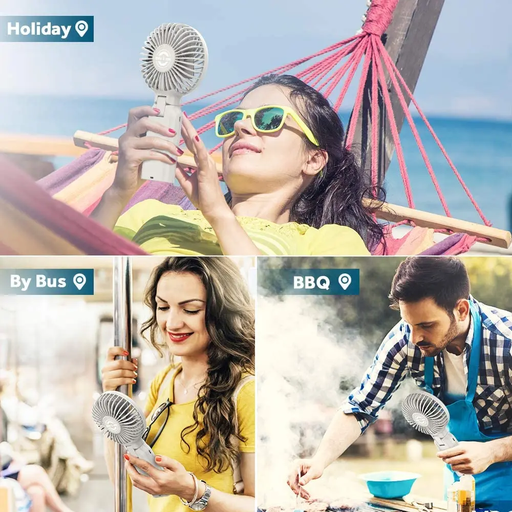 Вес всего 120 г и только такой большой, как ладонь вашей руки, отсек можно легко застревать в рюкзаках или сумочках, а также в карманах для рубашек/брюк. Идеальный ручной вентилятор для жарких летних дней, подходит для детей, пожилых людей и женщин, а также подходит в качестве подарка.