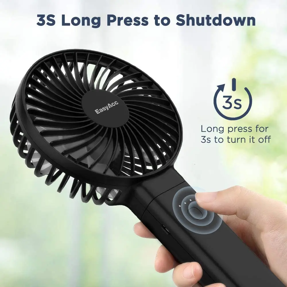 Единственный ручной вентилятор с функцией выключения одним касанием. Нажмите и удерживайте кнопку питания в течение 3 секунд, чтобы выключить портативный вентилятор, избегайте многократного нажатия кнопки питания и сделайте вентилятор батареи более удобным в использовании.