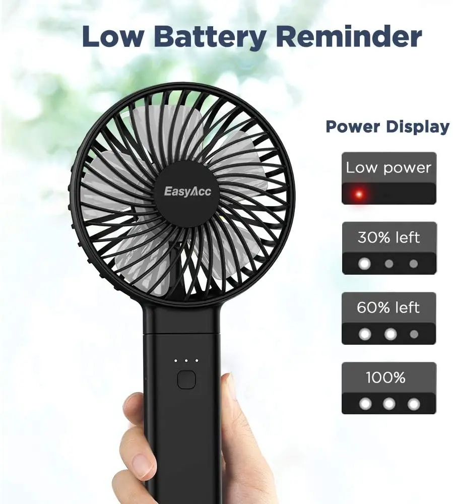 Уникальный вентилятор батареи на Amazon с напоминанием, когда батарея низкая. Нажмите кнопку питания, чтобы увидеть, сколько энергии осталось, и если Персональный вентилятор нуждается в зарядке. Светодиодный индикатор состояния: 1) все 3 светильник s на: полностью заряжен; 2) светильник s на: 60% электричество слева; 3) 1 светильник: 30% слева (Примечание: светодиодный индикатор мигает во время зарядки. После того, как он полностью заряжен, он будет продолжать.)