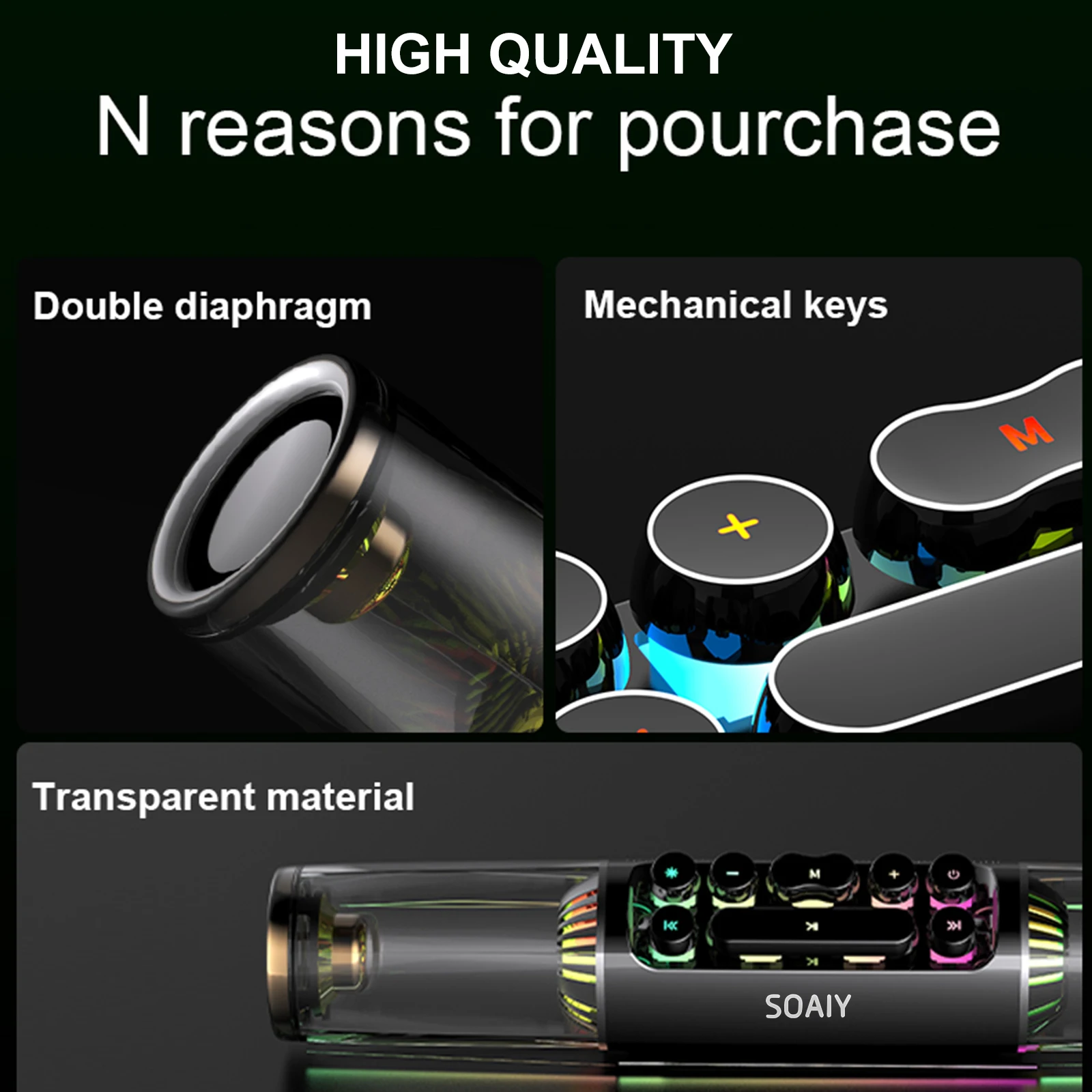 Высококачественный АБС-материал, полупрозрачный корпус динамика, с 16 RGB световыми эффектами, изменения освещения, улучшают атмосферу фона.