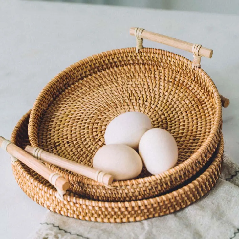 Ротанг ручной работы круглый поднос для хранения еды тарелка с деревянными ручками плетеная корзина деревянный поднос для фруктов Хлебница