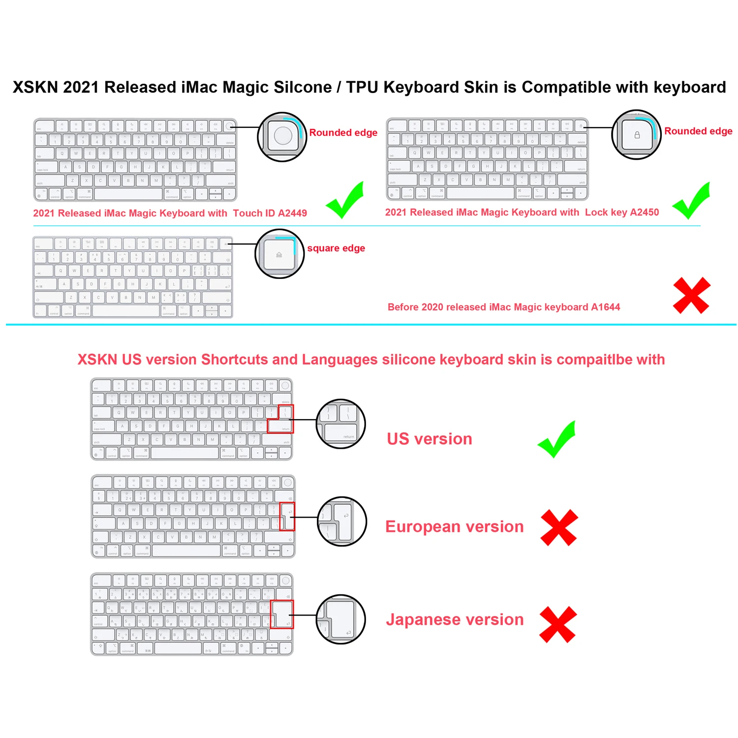 1. Подходит для 2021 новейшего чипа Apple M1 iMac 24-дюймовая Волшебная клавиатура A2449 с Touch ID и A2450 с ключом блокировки. (Не для 2015 выпущенных клавиатур Magic Keyboard A1644-MLA22LL/A,A1644-MLA22B/A и всех клавиатур Apple iMac с цифровой клавиатурой)