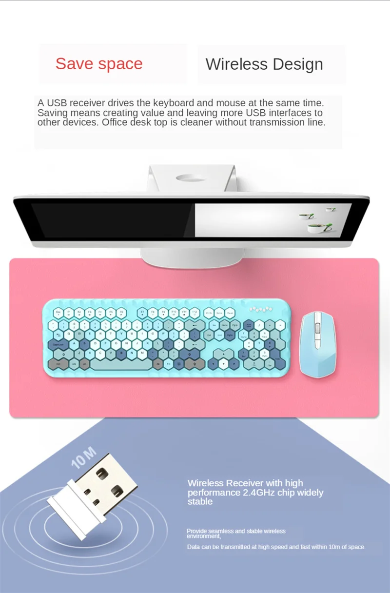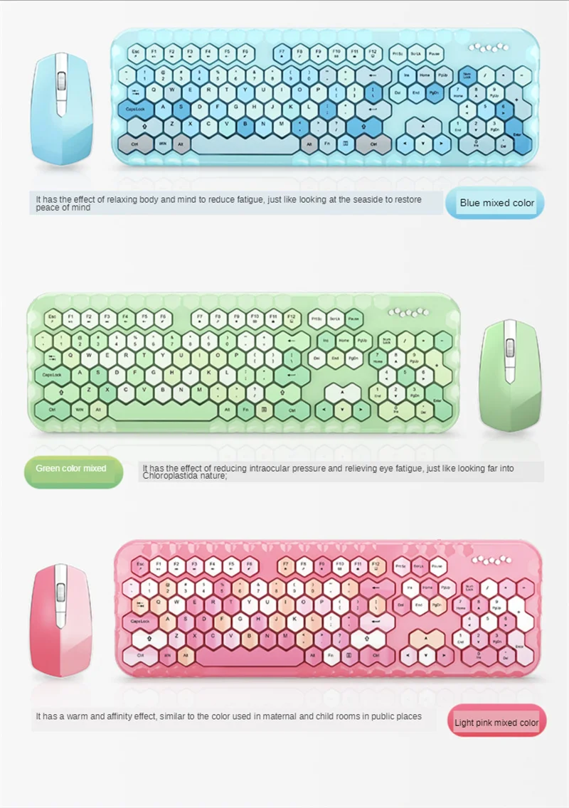 Разные яркие цвета клавиатуры и мыши Combos шестиугольная Кепка 2,4G Беспроводная клавиатура набор мышей для ноутбука ПК подарок для девочек