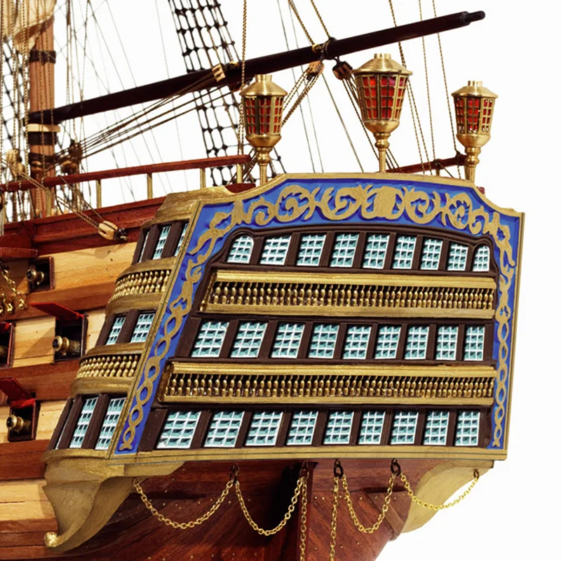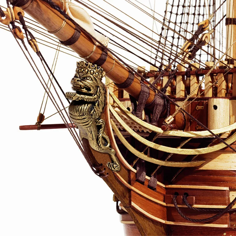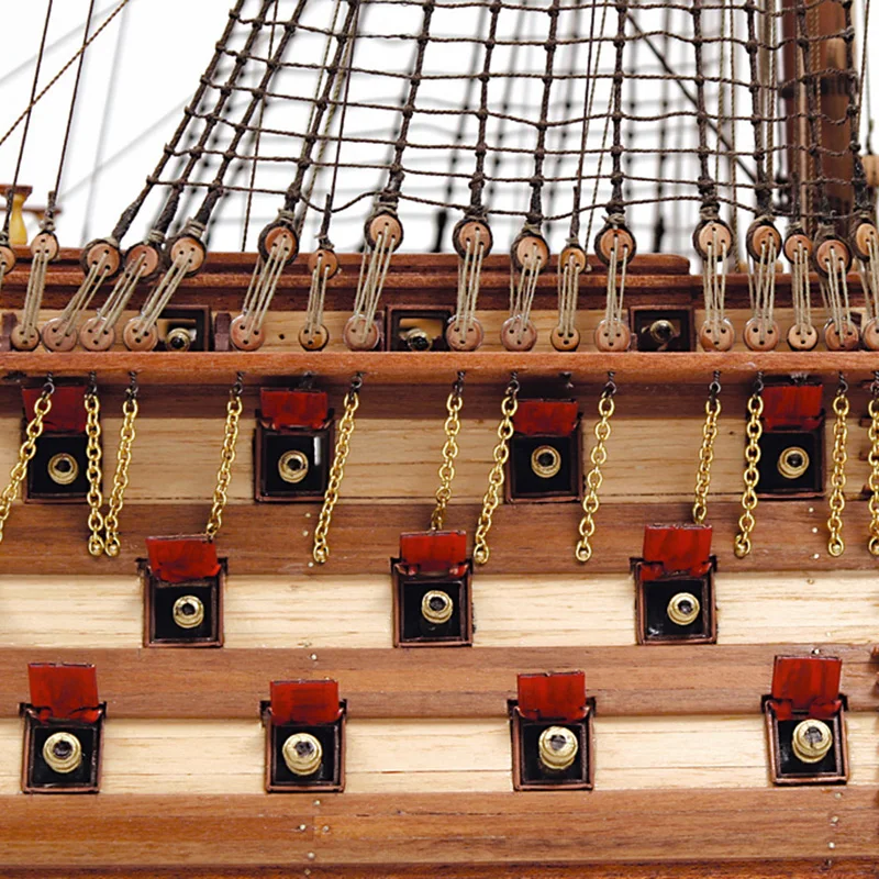 Огневая мощь корабля состоит из точеных латунных пушек и фальконетов. Из металла сделаны пушечные станки и пушечные порты, а латунные цепи, заготовки для решеток, якоря из черненного металла, литой искусный транец весьма высокого качества, лист фототравленного орнамента окон и носовая фигура добавляют модели реализма. Шлюпки модели этого корабля представляют собой маленькие проекты - каждая собирается по наборной технологии с полноценной обшивкой и изготовлением всей мелочевки. Сотни самшитовых блоков и юферсов ввязываются в нити четырех диаметров. OcCre обеспечивает модель корабля полным набором парусов и флагами.