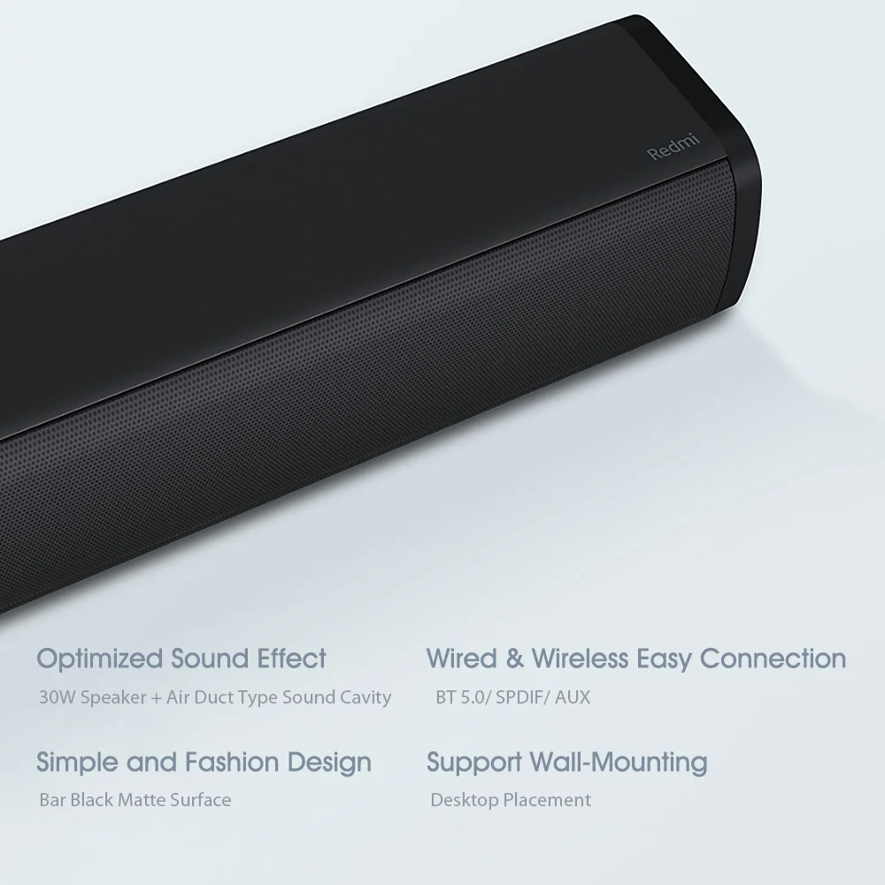 Main features:● 30W speaker with ducted sound cavity● Comes with wall mount● Stylish simplicity fabric material design● Supports wall and seat installation● Wired and wireless easily connect● Bluetooth-Compatible 5.0 / SPDIF / AUXSpecification:Brand: Xiaomi RedmiCompatible with: TVSupports: Bluetooth-Compatible 5.0Input: Bluetooth-Compatible 5.0/SPDIF/AUX/ Coaxial InputConnection: Wireless and wiredProduct weight: 1.5 kgExternal audio input interface: 3.5mm stereo AUX input, coaxial inputPower: 30WSound range: 80Hz- 20000HzRated impedance: 4 ohmsProduct size (L x W x H): 83.00 x 7.20 x 8.70 cm / 32.68 x 2.83 x 3.43 inchesPackage Contents: 1 x TV Stereo, 1 x Chinese User Manual, 1 x SPDIF Cable, 2 x Screw, 2 x Expansion Screw,2 x EVA foam padA good speaker for TV The Redmi TV sound bar adopts atmospheric and elegant matte black, which makes the entire sound simple and atmospheric. The simple connection and free placement bring a more free home viewing experience. The high-quality sound tuned by the master makes The overall entertainment experience of TV has been upgraded againMultiple connection methods Wired and wireless are convenient Support Bluetooth-Compatible 50 wireless connection, easy connection without cable "system. At the same time support 5 / PDIF and AUX wired connection, only one. Connect the TV to say goodbye to clutter, easy entertainment.