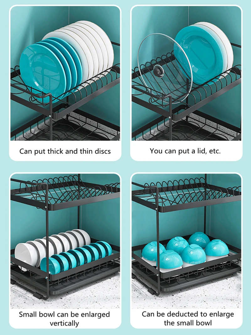 2 уровня со сушилкой для посуды: Большая емкость, подходит для размещения столовые приборы для три раза в день. Отдельные отделения: Humanized для хранения тарелок, чаш и бутылок, гораздо стабильнее. Разумное расстояние, подходит для размещения различных размеров блюд.