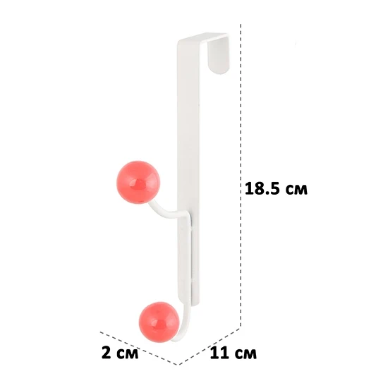 На дверь, оснащена 2 крючками, выполнена из качественного металла и имеет пластиковые наконечники на крючках. Размер 11х2х18,5 см. Вешалка подходит для дверей толщиной до 4 см.