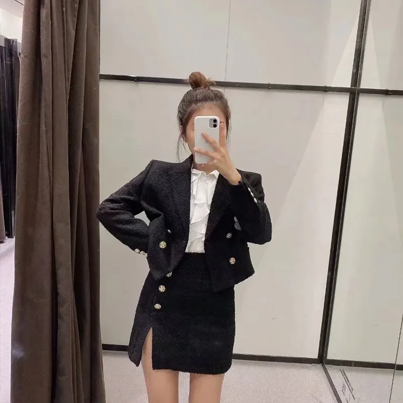 Отзывы о Женский твидовый костюм с юбкой Za офисный двубортный пиджак высокой талией и