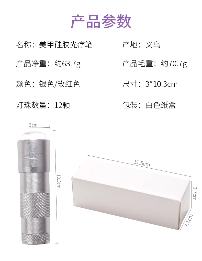 Описание:100% Новинка и высокое качествоМодель: аккумуляторТип батареи: 3 батарейки AAA (не входят в комплект)Цвет: серебристый Особенности:(1) Лак для ногтей БыстросохнущийРучные УФ-лампы для дизайна ногтей могут обеспечить хорошую оптическую производительность, Сверхсильные ультрафиолетовые лучи, более быструю фототерапию и быстросохнущее тиснение ногтей, чем обычные светодиоды. Вы можете Расплющить блестки, блестки и другие аксессуары во время нажатия, так что аксессуары остаются плоскими на поверхности ногтя.(2) Безопасная УФ-лампаПортативная УФ-лампа для ногтей-это Сушилка для ногтей в форме звезды, оснащенная 12 светодиодными лампами. Использование улучшенных источников света больше не вызывает головокружения или дискомфорта глаз. Ультрафиолетовые лучи безопасны и не повлияют на ногти или маникюр.(3) Портативный и удобныйКомпактный карманный фонарик может поместиться в кармане, автомобиле, ящике стола и рюкзаке. Он небольшой, легкий и простой в использовании. Очень подходит для ежедневной переноски.(4) Широкая совместимостьИнструменты для ногтей для персональных маникюров или профессиональных маникюров. Подходит для домашнего и профессионального использования. Идеальный подарок для тех, кто любит дизайн ногтей.(5) Прочный и высококачественныйФонарик состоит из алюминия и силикона, который очень мягкий на ощупь и прочный. Фонарик использует 3 батарейки типа AAA (не входят в комплект). Тело держится в течение нескольких часов света. Меры предосторожности:Мощность: 0,6 Вт (только временно фиксированные Аксессуары)После того, как аксессуары будут временно закреплены, они должны перейти к фарам для полного отверждения!Вам нужно взять с собой 3 аккумулятора AAA!Силиконовая головка очень мягкая и легко царапается острыми ювелирными изделиями. Перед использованием рекомендуется обернуть его слоем пластиковой пленки.Острые украшения на краю ногтя могут легко поцарапать силиконовую головку, но это не влияет на использование.При чистке Используйте ленту, чтобы ее легко снять.Не используйте чистящие жидкости, руки или острые предметы для обработки, силиконовая головка легко ломается. В комплект входит: 1 шт. силиконовая портативная лампа для дизайна ногтей (без аккумулятора)